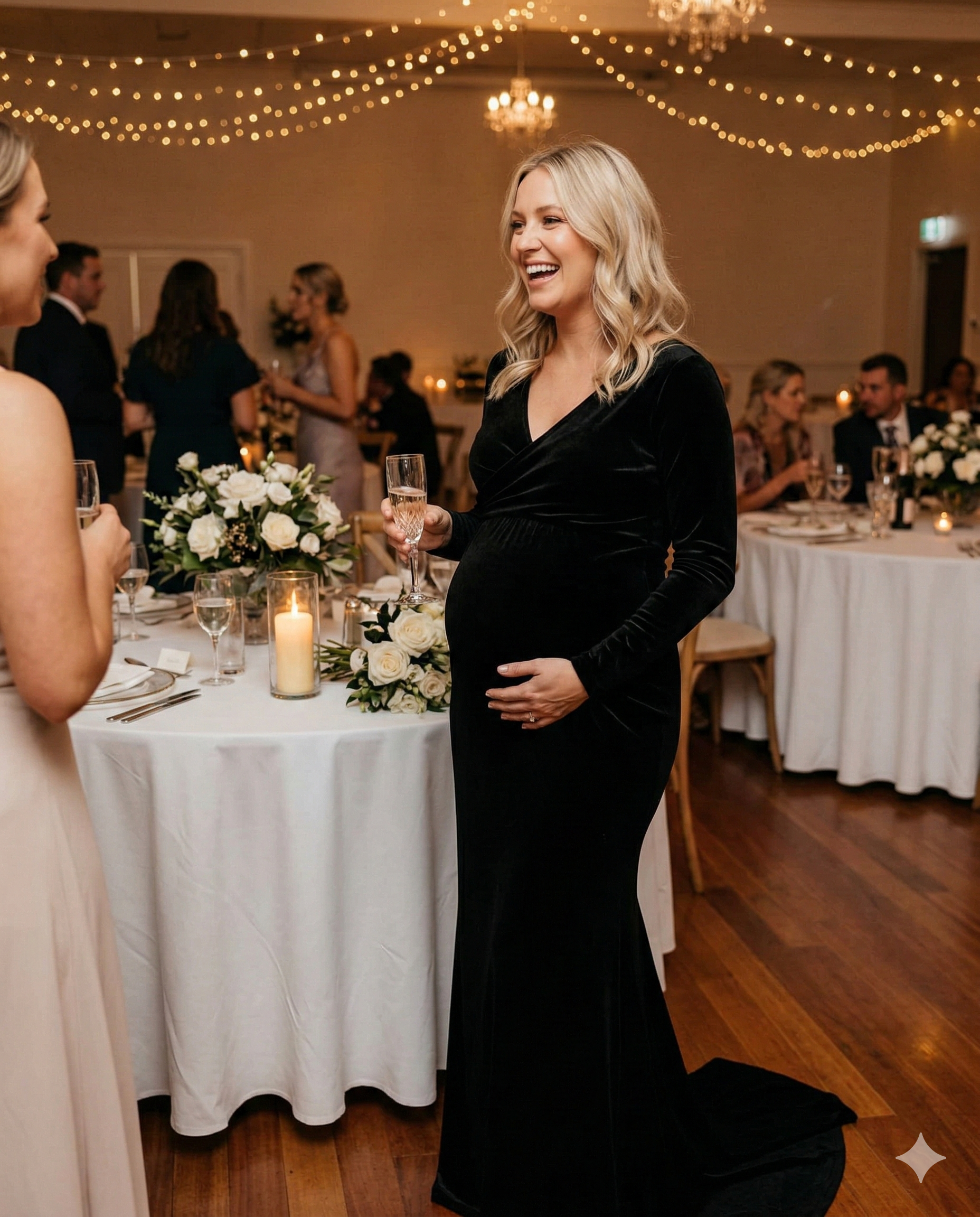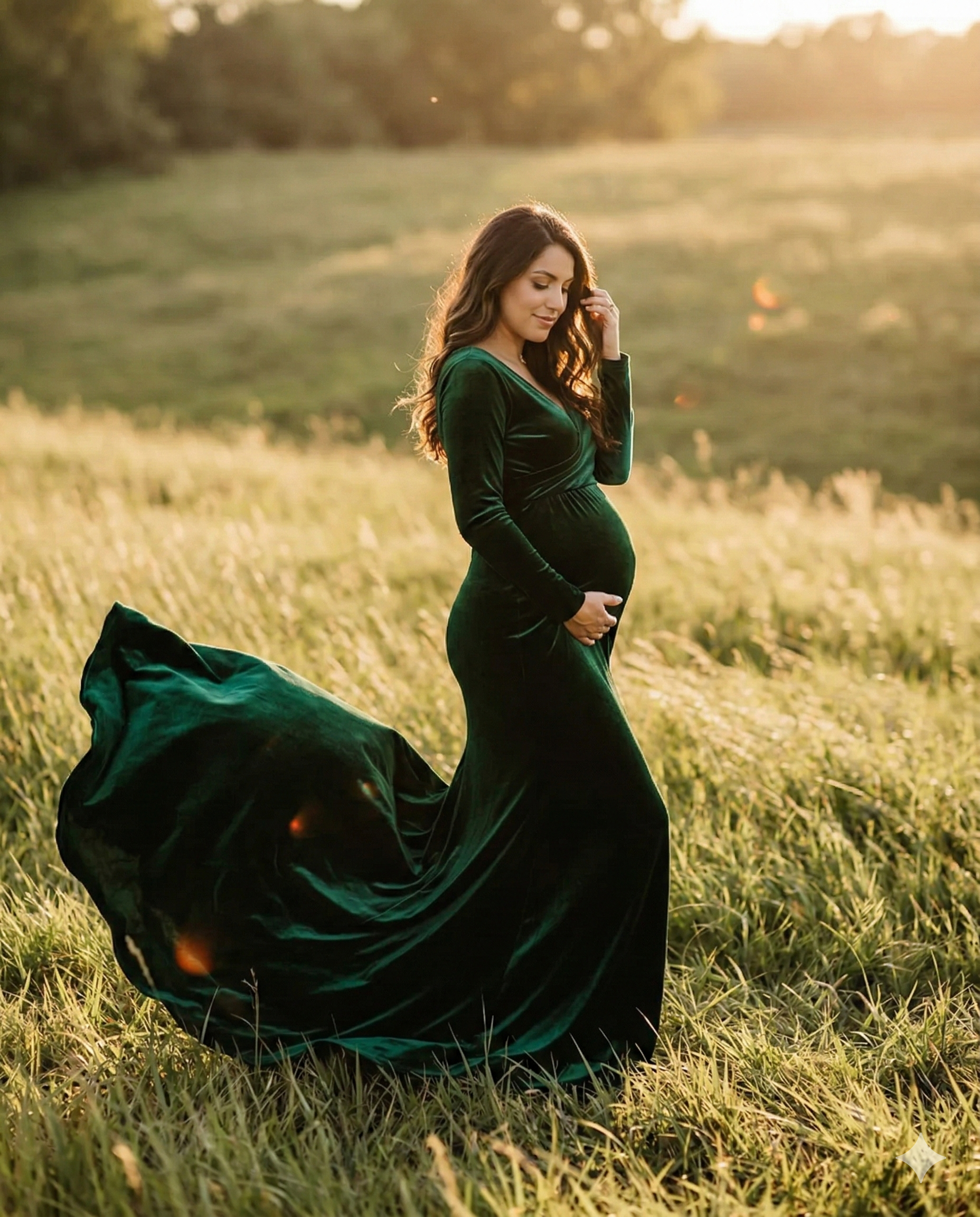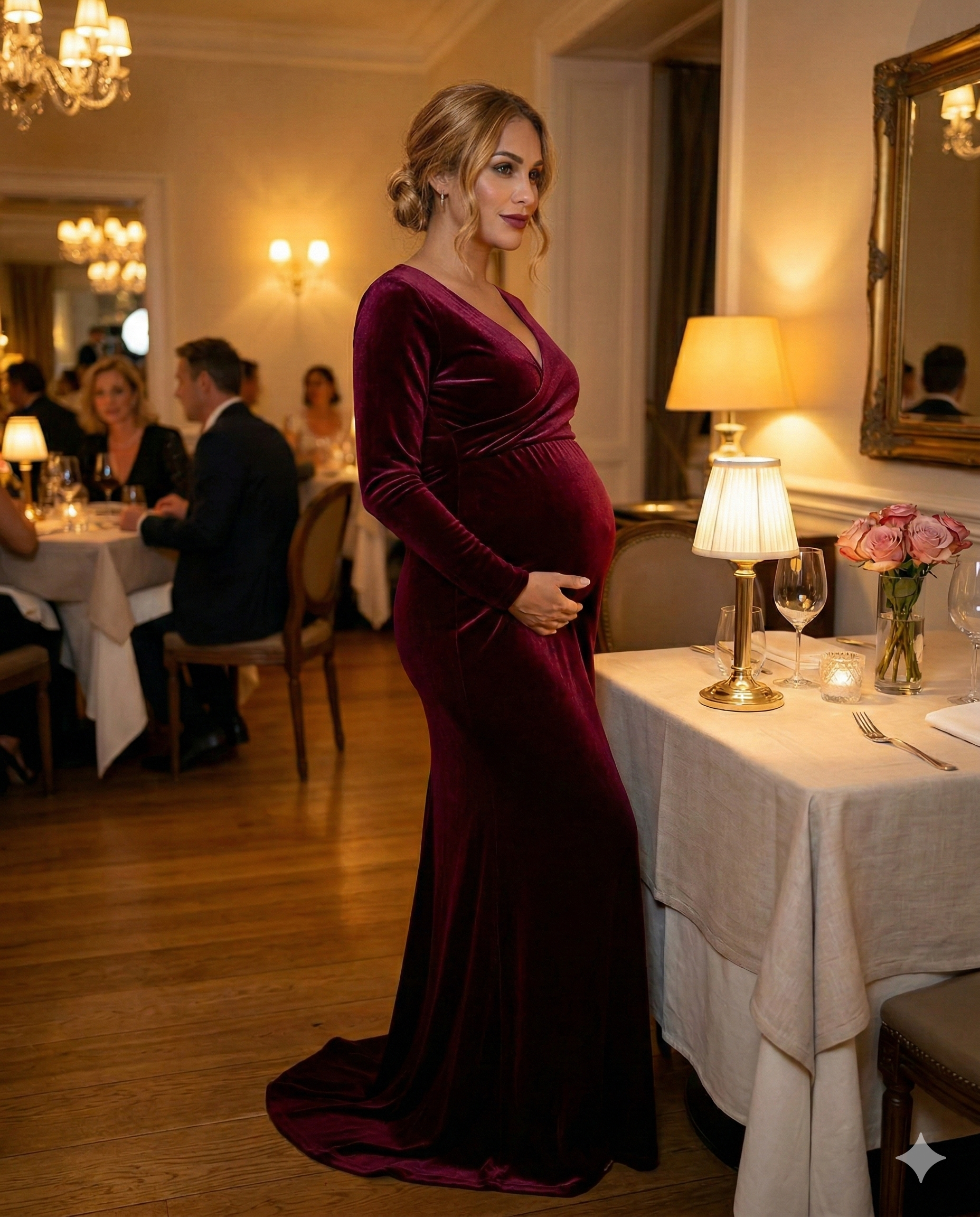 “I wore this for my maternity shoot at 29 weeks and my photographer was obsessed with the way the train moved. The velvet catches light beautifully, it looks even better in pictures than in person. I was worried it might be too warm, but it actually felt breathable during our 2-hour session. It hugged my bump in the most flattering way.”