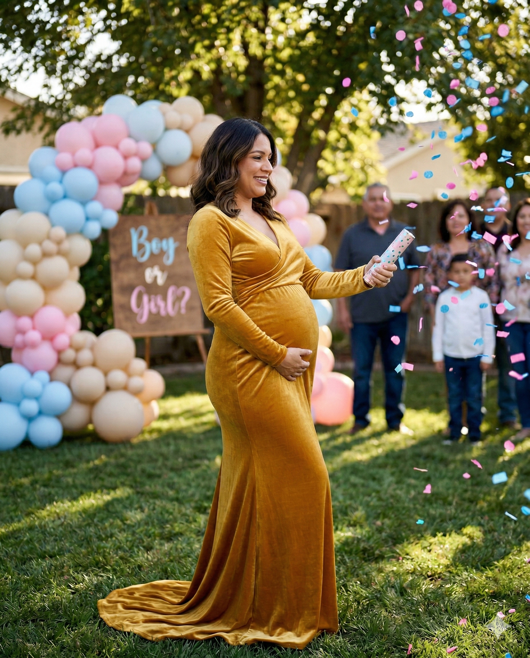 “We chose this for our backyard gender reveal at 26 weeks and it was exactly the look I wanted, dramatic but still classy. The lining made me feel secure (not see-through at all), and the deep V wasn’t too low. It stretched comfortably over my bump and looked amazing in the confetti photos. I got so many messages asking where I got it.”