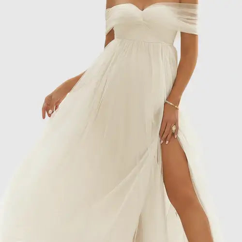 Feel radiant in this Flowing Off-Shoulder Maternity Gown, designed to highlight your pregnancy glow in every frame. Featuring a romantic off-shoulder neckline, a flowing silhouette, and a dramatic high slit, this gown creates elegant movement and striking maternity portraits.