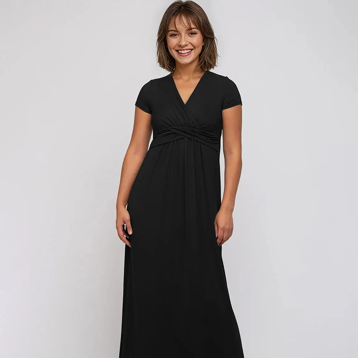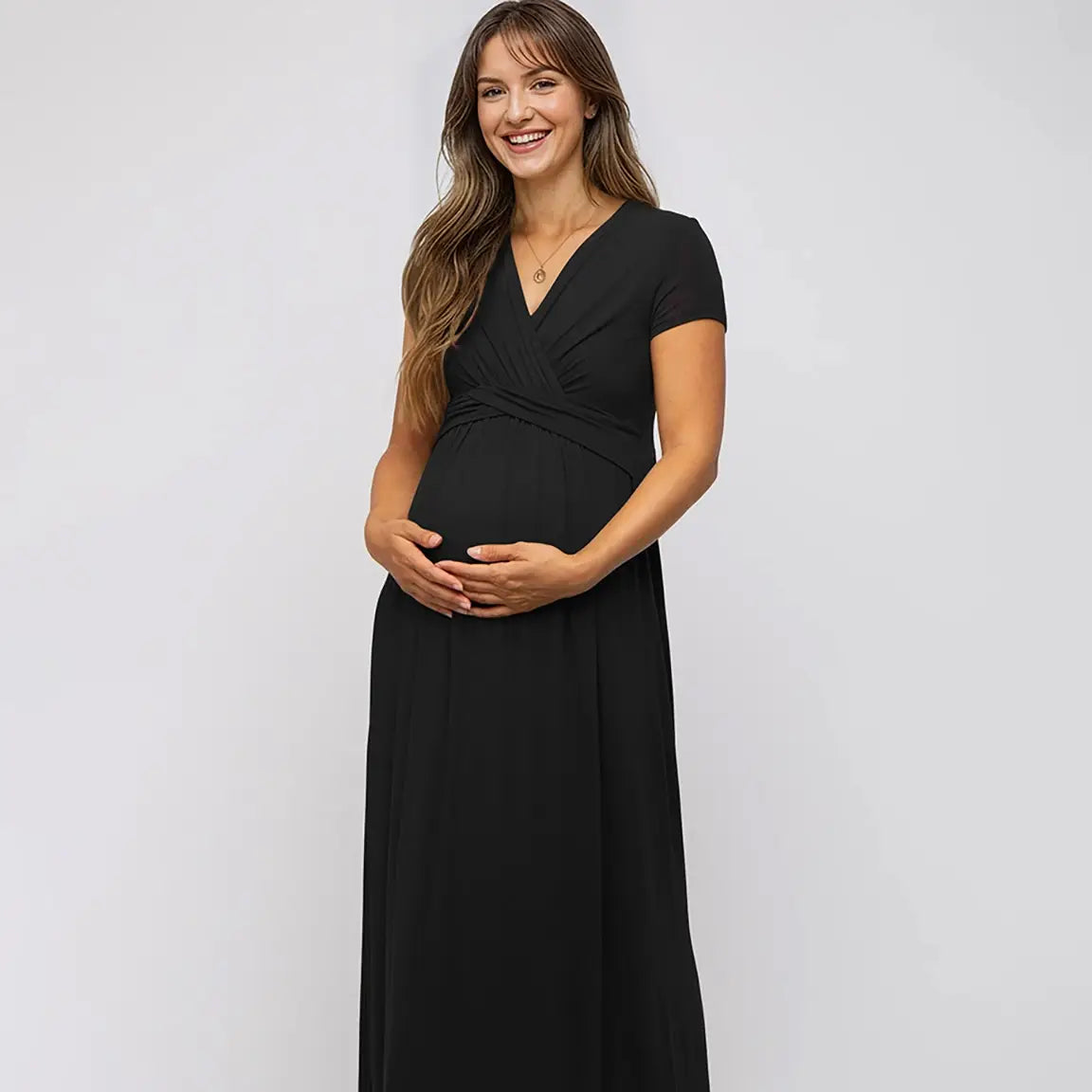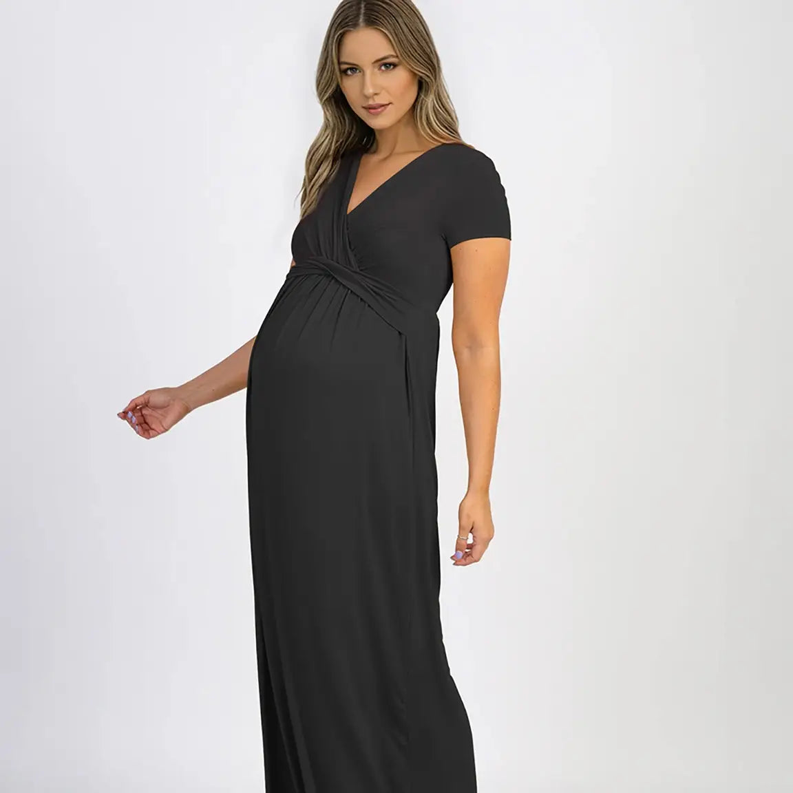 Stay stylish and comfortable during pregnancy and nursing with this Draped Maxi Dress. Soft, stretchy fabric moves with your body and flatters your bump, while the draped front provides easy nursing access. Its long, flowing silhouette is perfect for casual outings or special occasions, making this versatile dress a must-have for moms who want comfort and style.