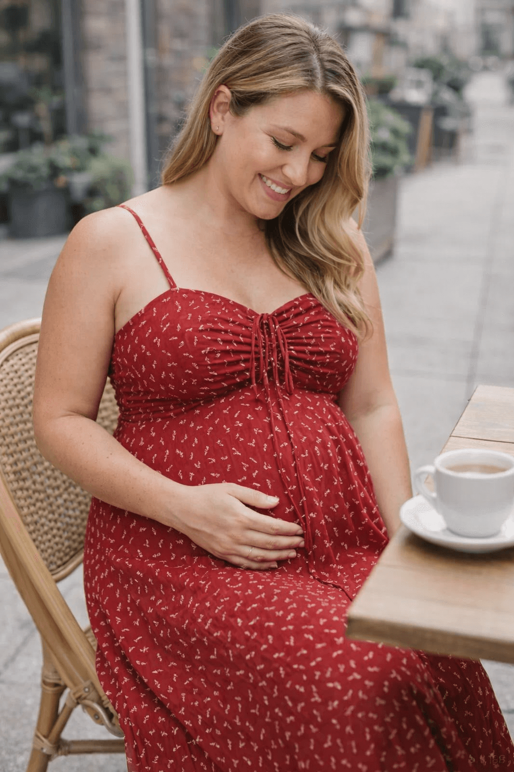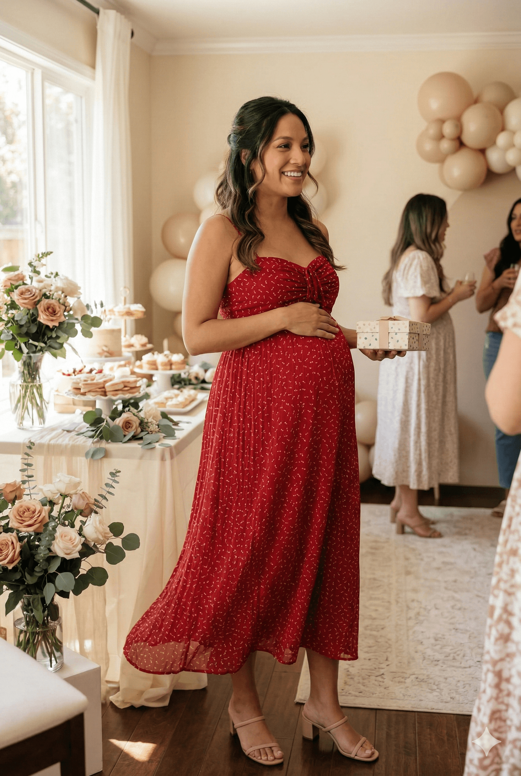 “I wore this at 27 weeks for my baby shower and it was exactly the vibe I wanted, soft and feminine without feeling too formal. The pleats move so nicely when you walk, and it didn’t cling to my bump at all. I felt comfortable the entire day and loved how it looked in photos.”