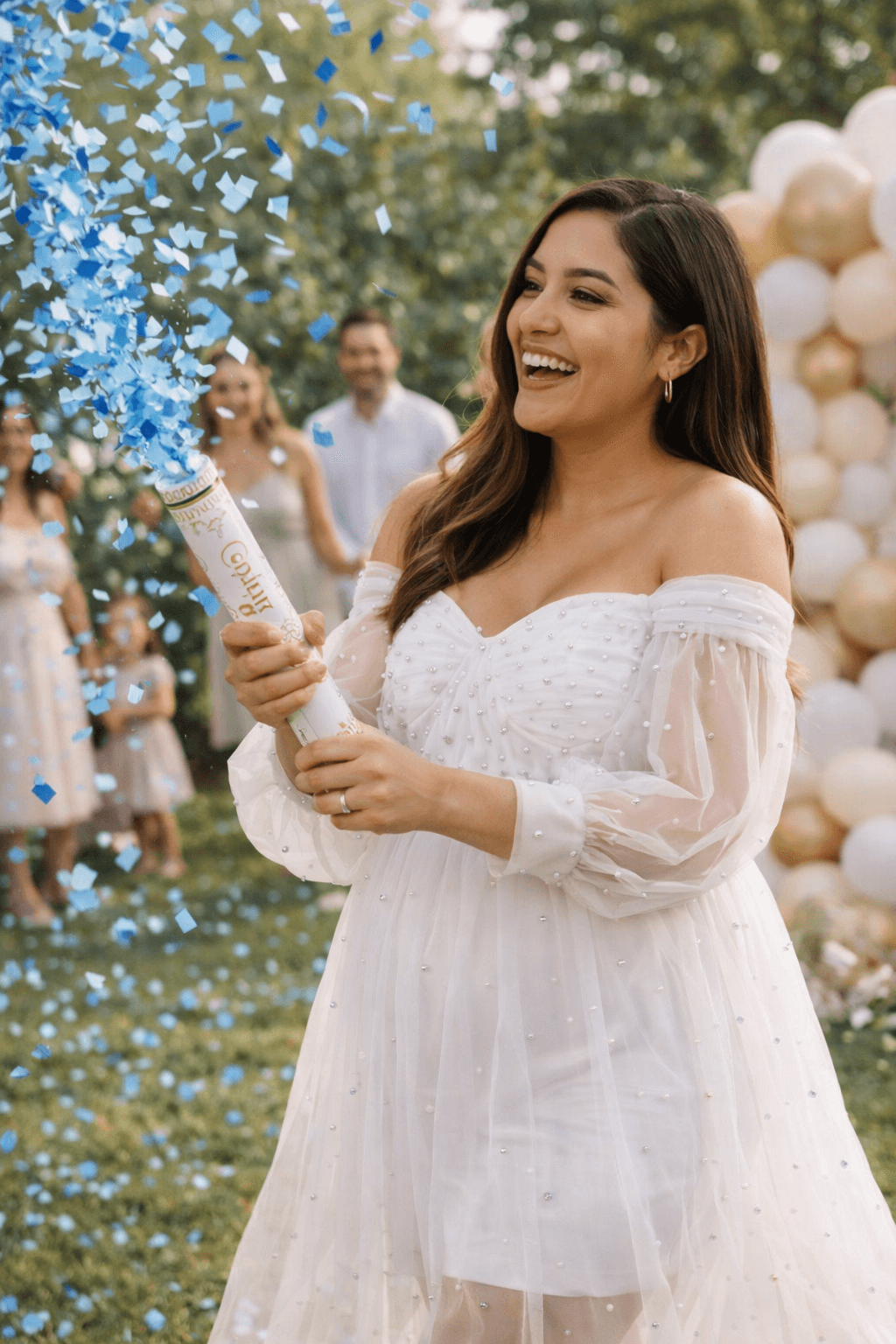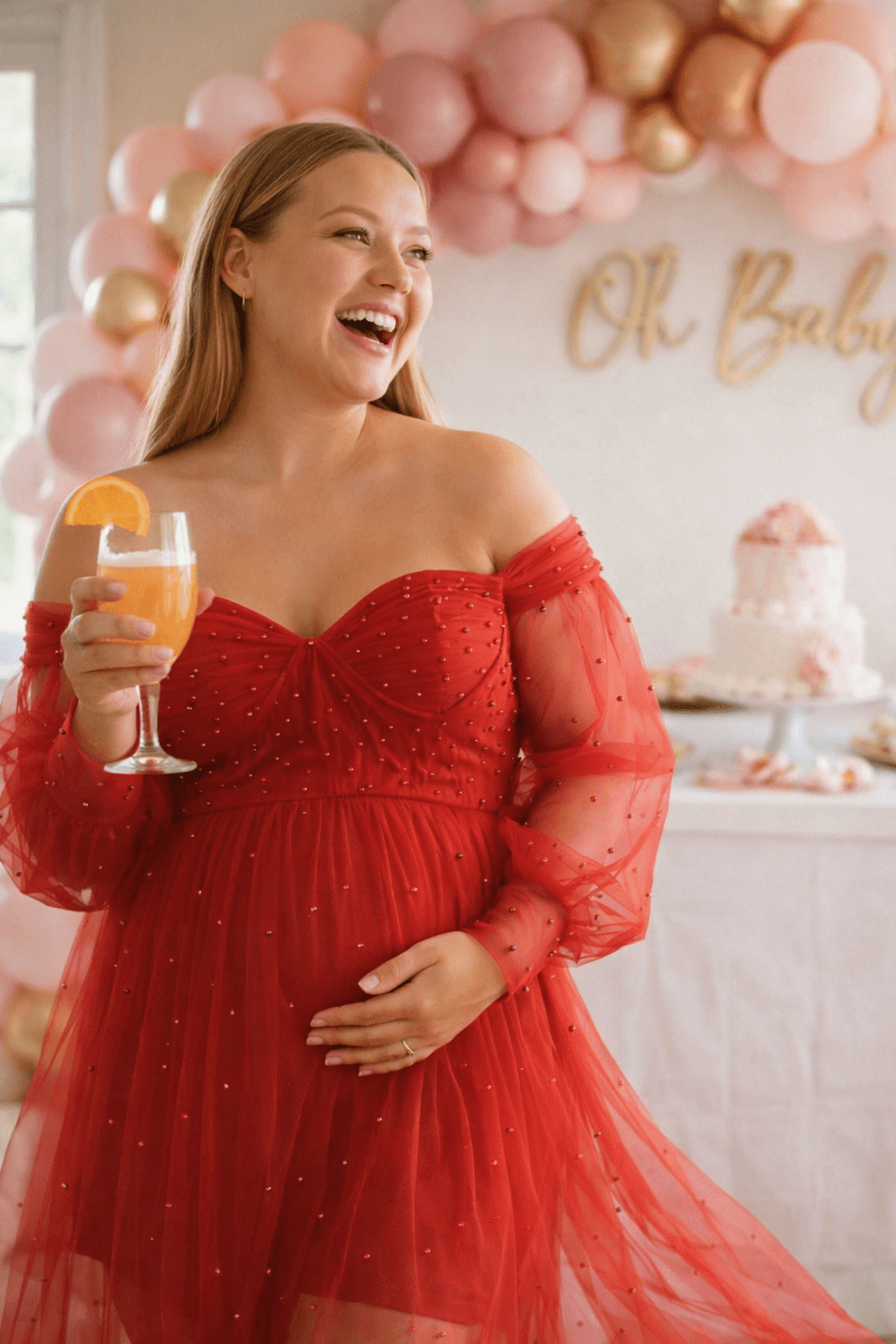 “Wore this for our backyard gender reveal at 20 weeks and it was exactly what I imagined. The lining made me feel confident (not see-through at all!) and it stretched comfortably over my bump. It looked so elegant in all the confetti photos.”