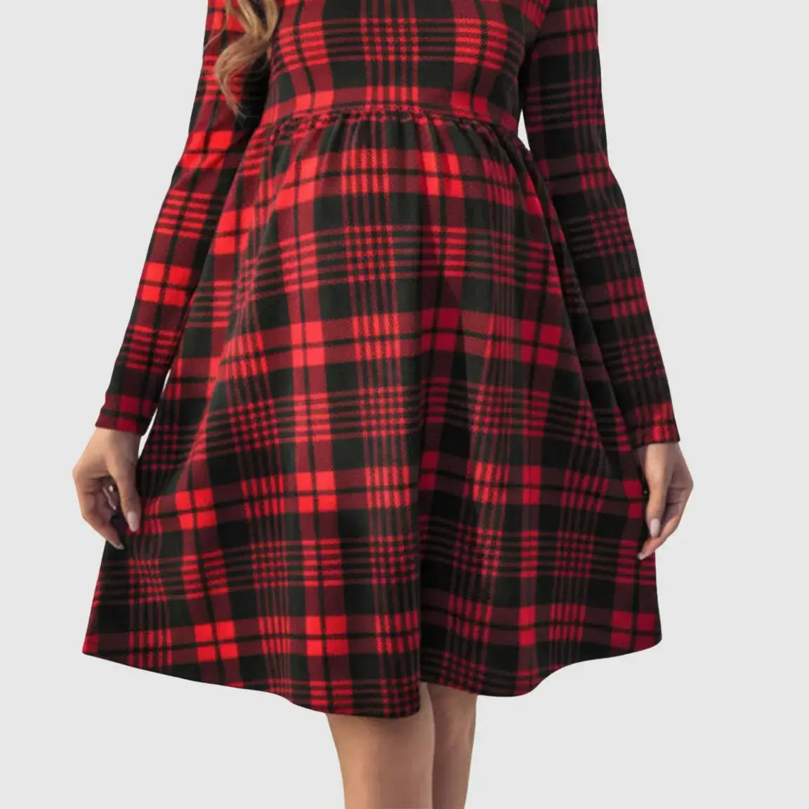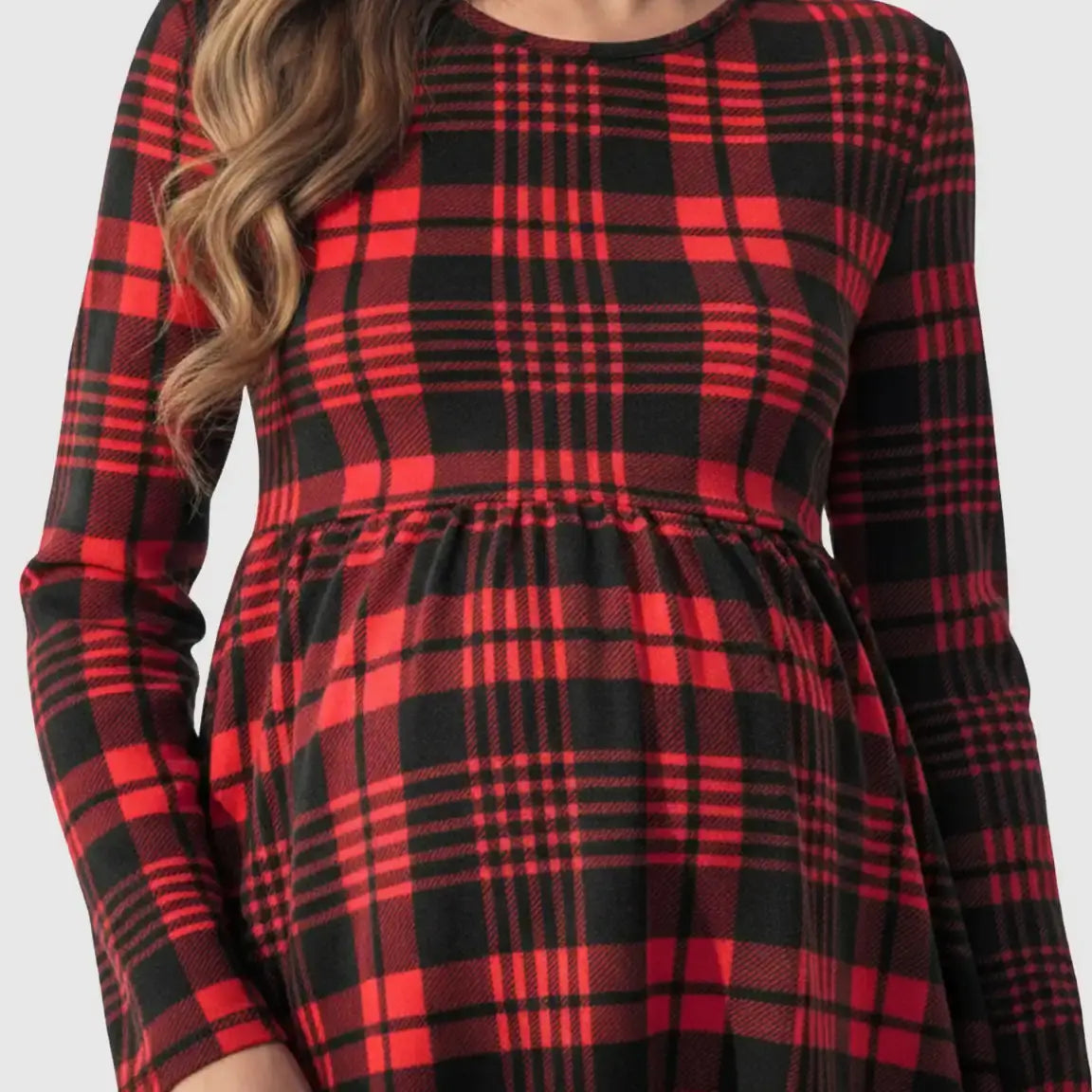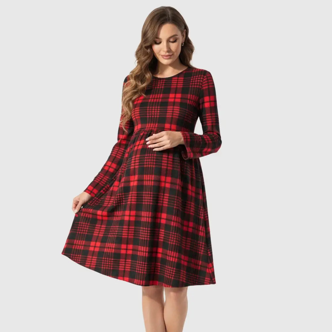 Meet your new everyday favorite: a red-and-black A-line maternity dress that blends cozy comfort with a timeless, stylish silhouette. The breathable, stretchy fabric gently adapts to your growing bump, while the long sleeves and round neckline keep you comfortable throughout your day. Designed for all maternity stages, it’s the perfect throw-on piece for errands, coffee dates, or casual outings, all with that cute, retro plaid charm.