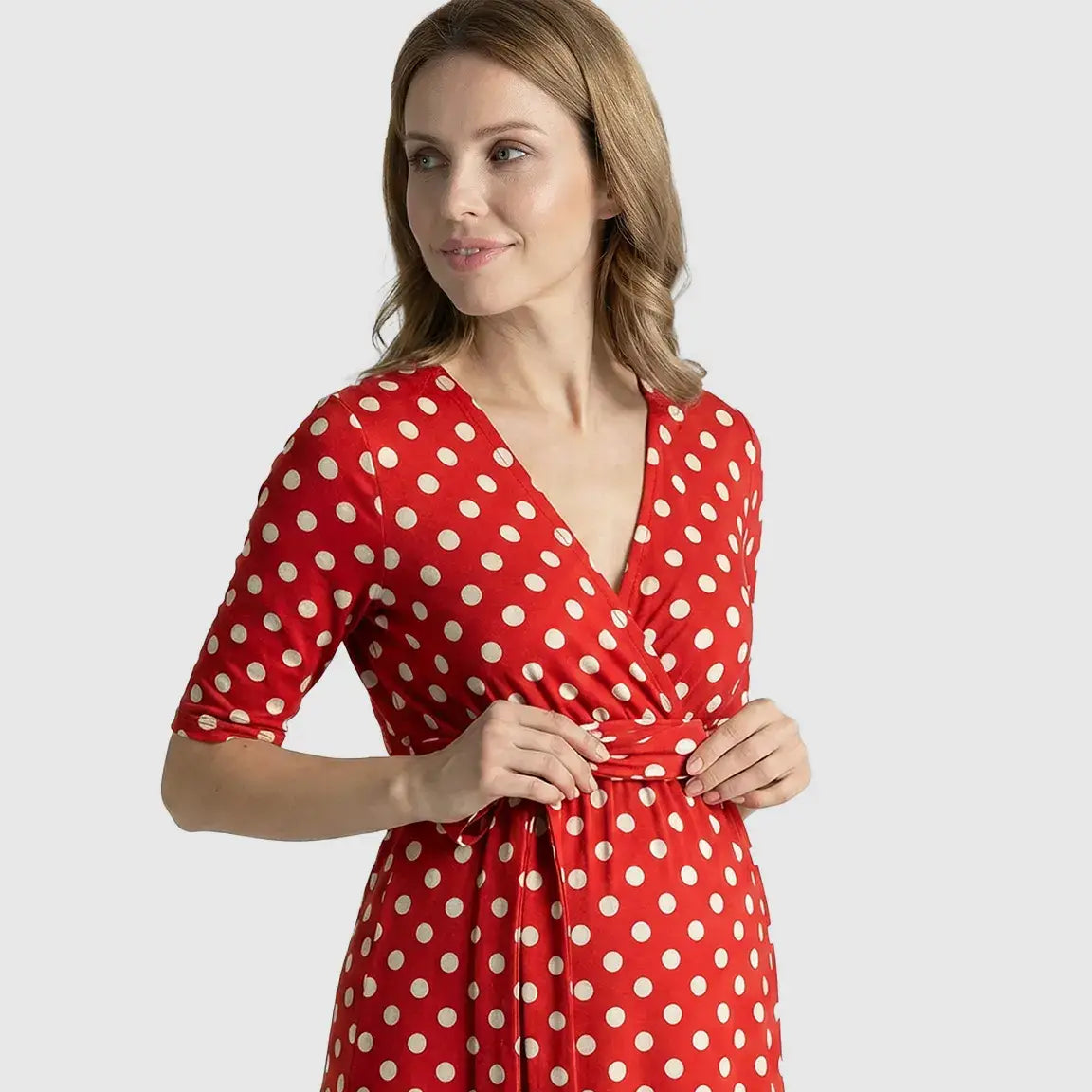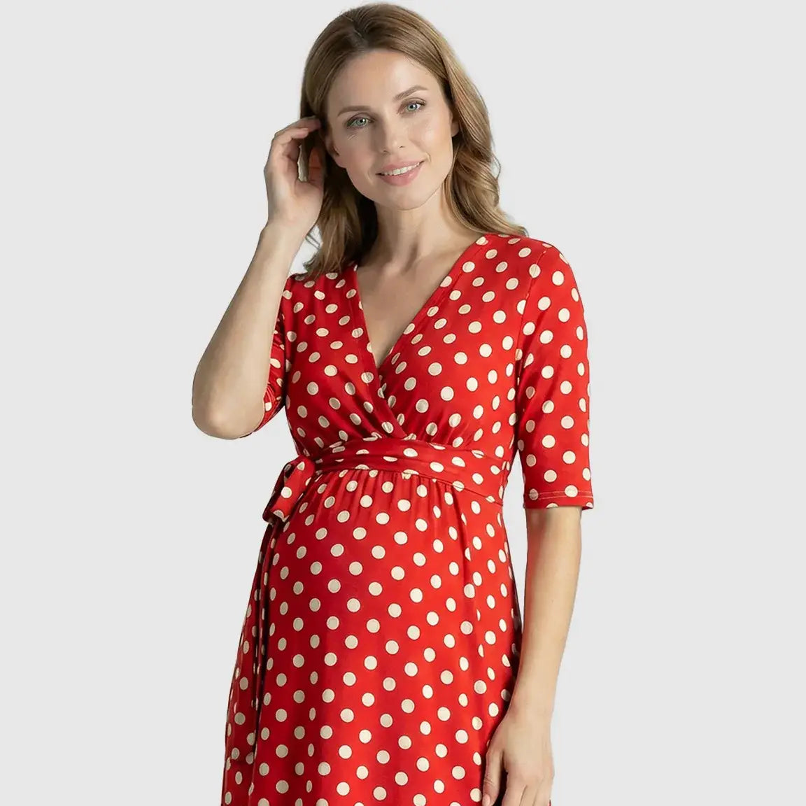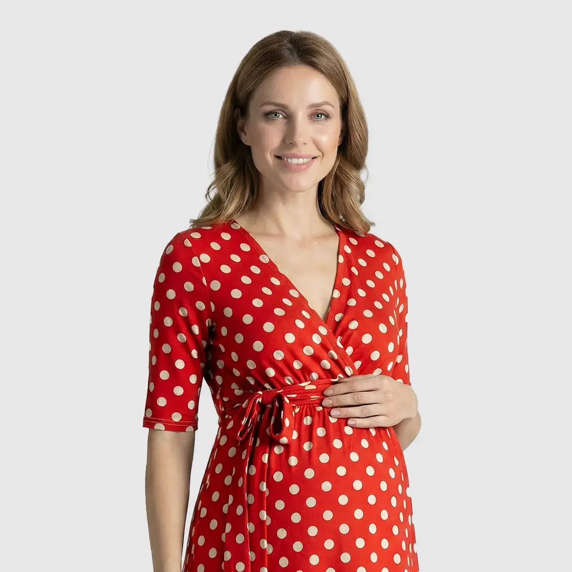 This adjustable waist polka dot maternity dress gives you a flattering V-neckline, a soft drape, and a classic polka dot print that never goes out of style. The lightweight fabric and flowy skirt keep you cool, comfy, and confident whether you're heading out for errands, brunch, or a well-deserved day out.