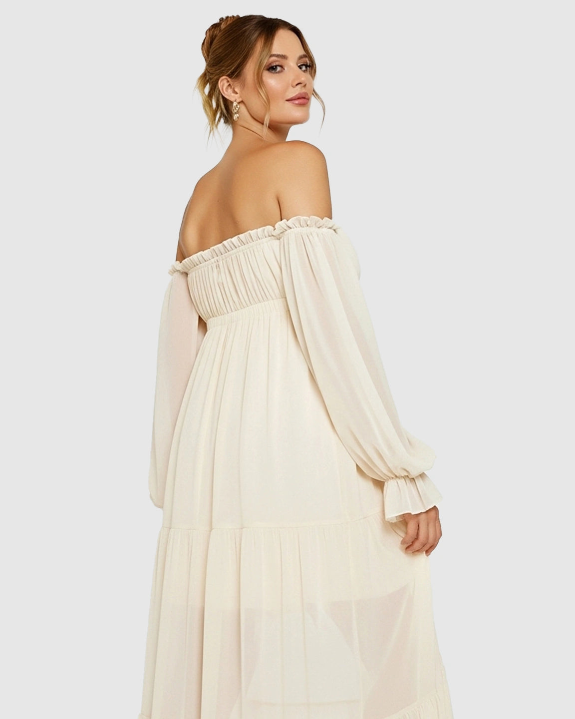 This gown drapes beautifully over your changing body, giving you that soft, glowy silhouette every mom deserves. The Bardot neckline off-shoulder adds just the right touch of elegance, while the tiered skirt moves with you, light, floaty, and totally picture-perfect. Whether you're dressing up for a maternity photoshoot gown moment or getting ready for a baby shower, this gown makes you feel confident, chic, and completely yourself.