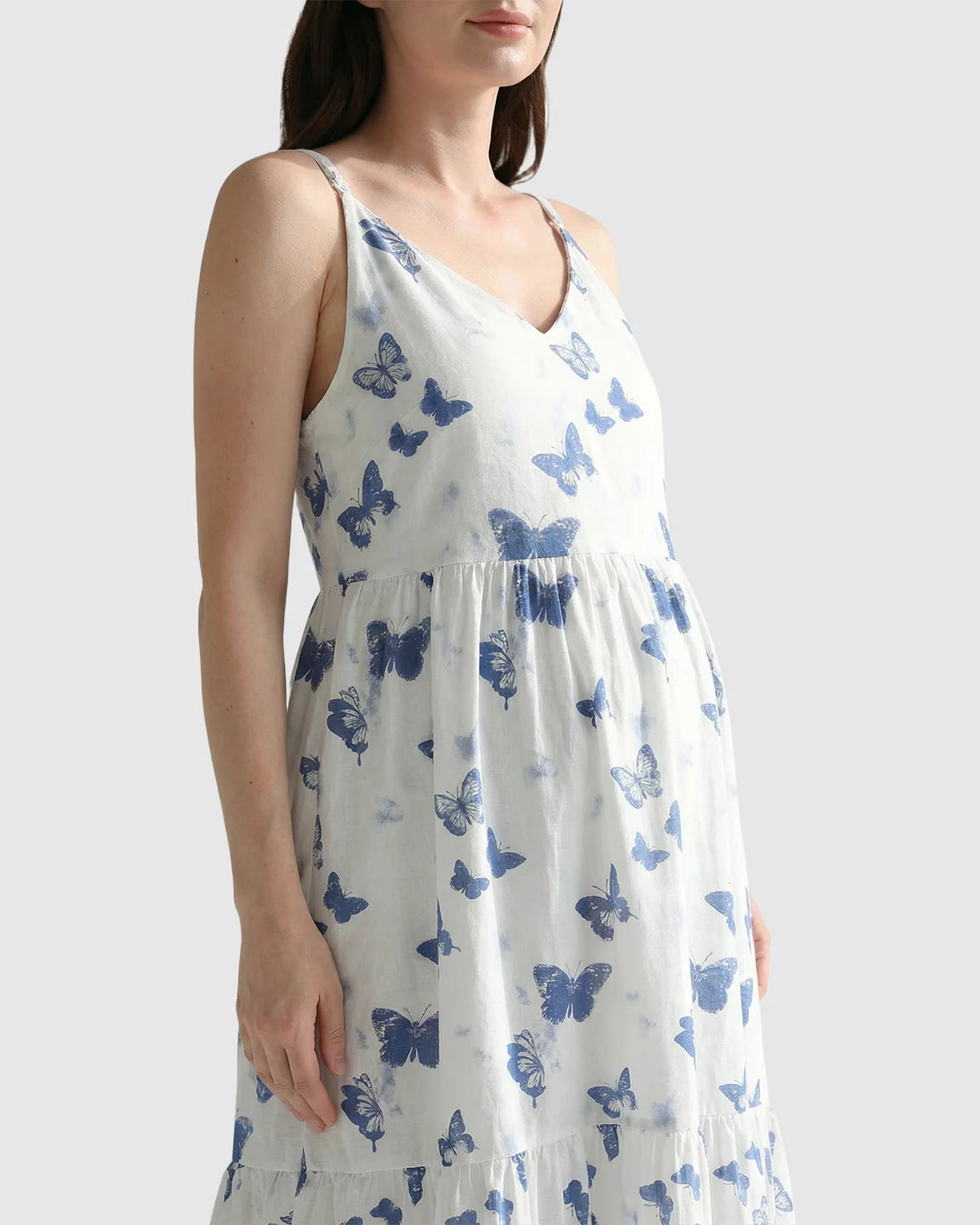 With a flowing V-neck babydoll silhouette and a calming blue-and-white butterfly print, it’s an easy, feel-good choice for sleeping, lounging, and slow mornings at home.
