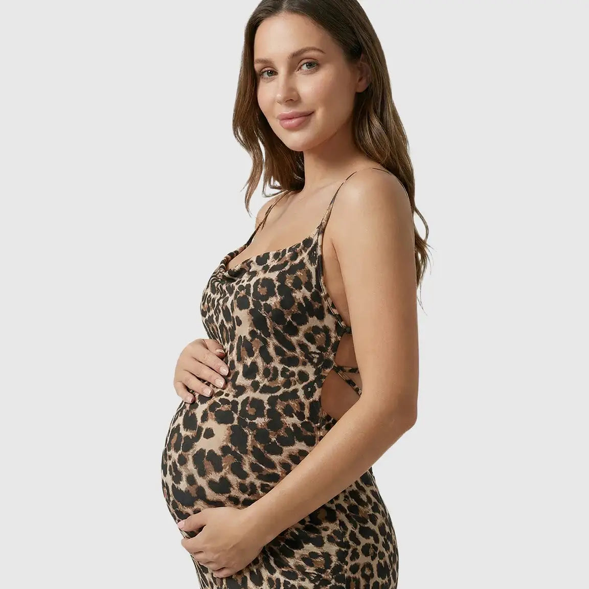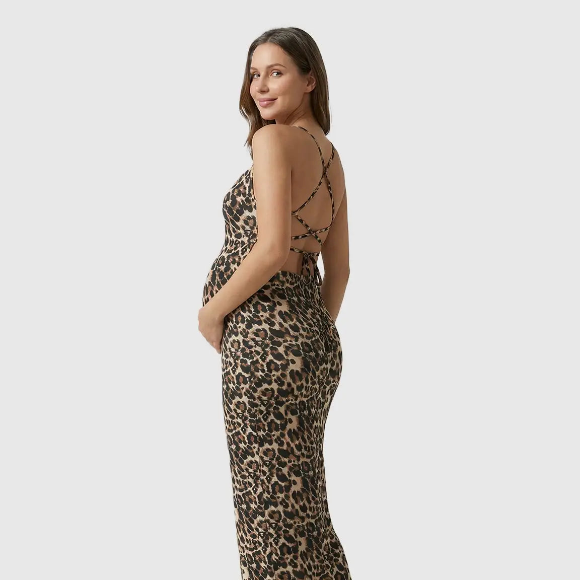 This curve-hugging maternity maxi dress is crafted with ultra-stretchy, soft fabric that grows with your bump while lifting and shaping your silhouette. The backless crisscross design and eye-catching leopard print create a stunning look perfect for maternity photoshoots, special events, and nights out. Made to flatter your changing shape from early pregnancy through the final trimester, it keeps you comfortable and confident all day.