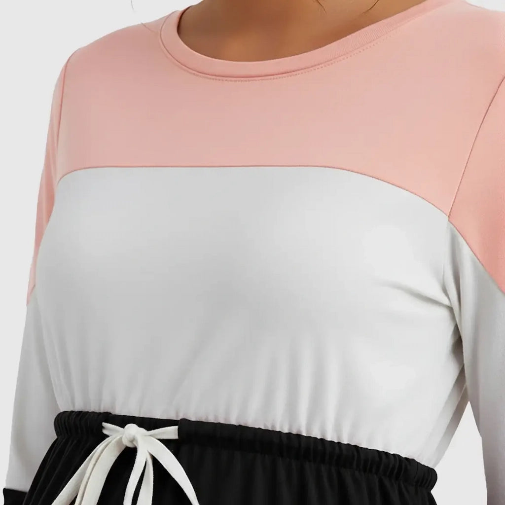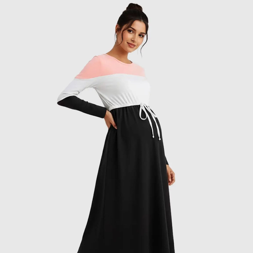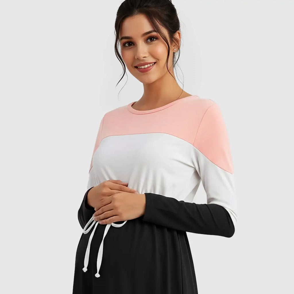 Designed with a flattering color-block contrast and gentle feminine charm, it blends modern style with everyday comfort. The faux two-piece look features a soft top joined to a flowing skirt, creating the illusion of layers in one easy piece. A flexible drawstring waist gently supports your bump for a perfect fit, while the smooth, breathable fabric moves with you all day. From baby showers to brunch, this one-piece dress makes effortless style feel beautifully natural.