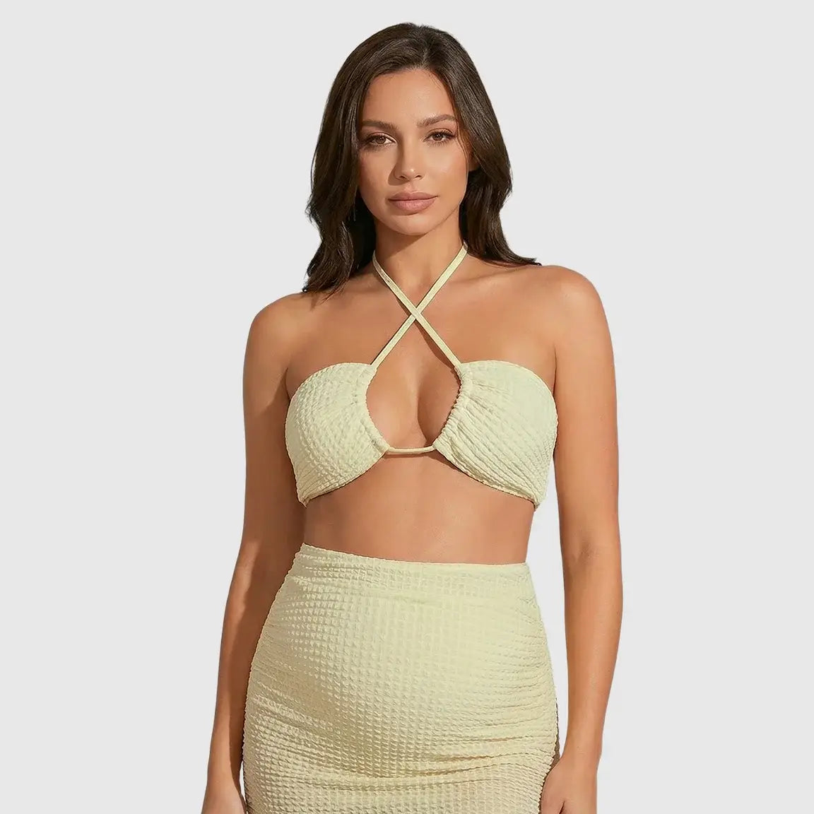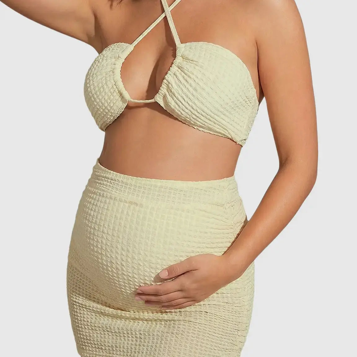 This Crisscross Halter Bikini-Style Maternity Swimsuit Set is designed with stretchy, textured fabric that adapts effortlessly to your growing bump while still giving you a flattering, lifted shape. The high-waisted bottom offers gentle belly support, and the stylish crisscross halter front adds a chic touch perfect for pool days, babymoons, or maternity photos. Soft, quick-drying, and bump-friendly, it’s made to keep you looking and feeling amazing throughout every stage of pregnancy.
