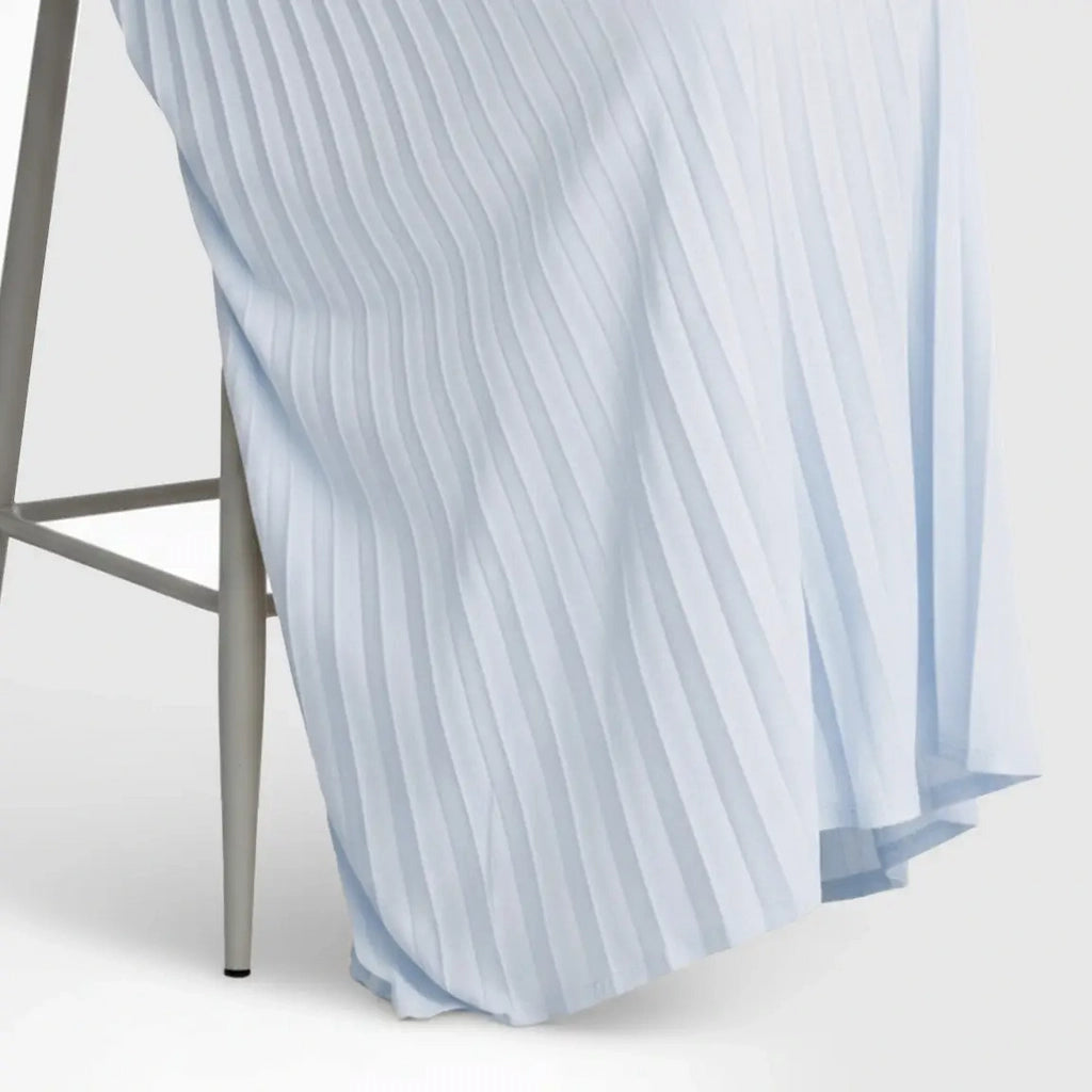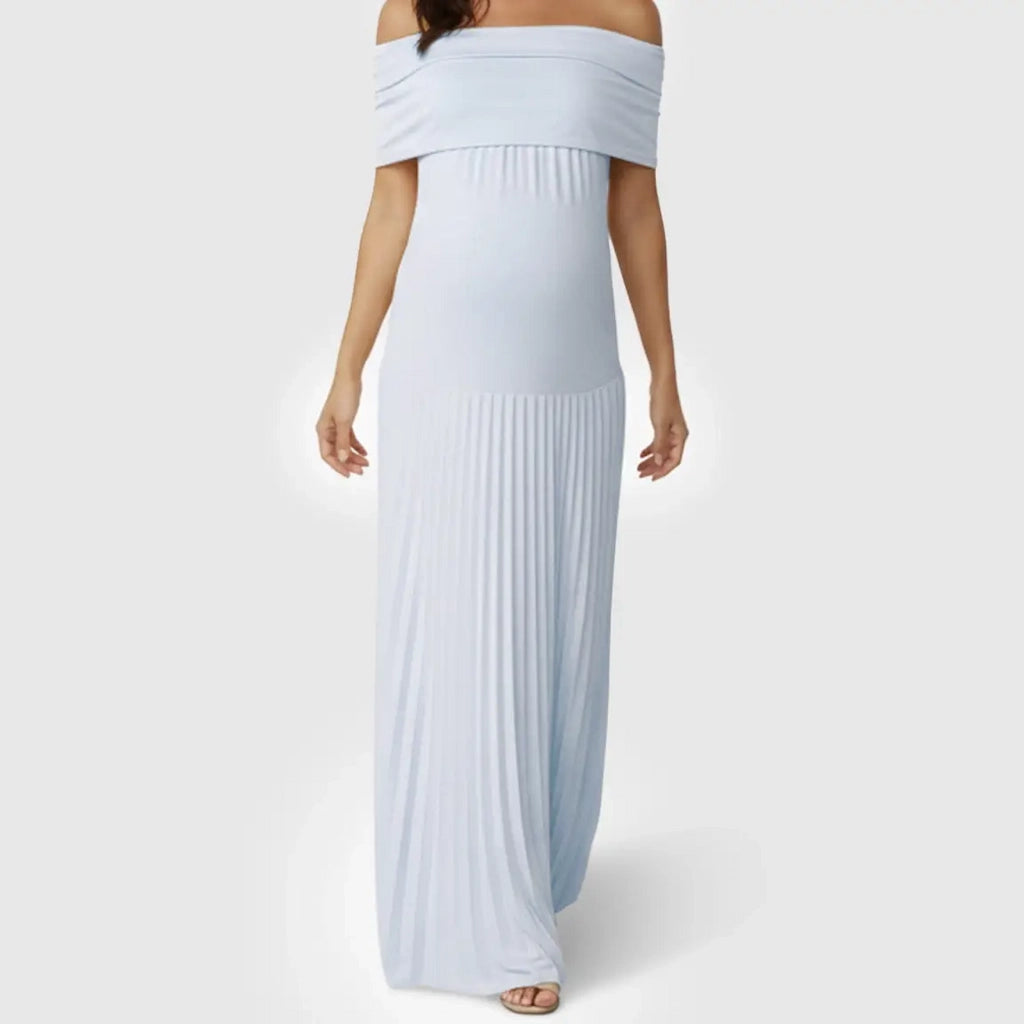 The off-shoulder neckline highlights your collarbones while the pleated maxi drape brings timeless sophistication to any event.