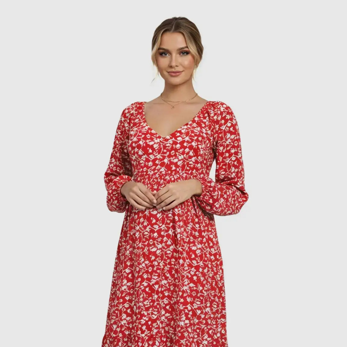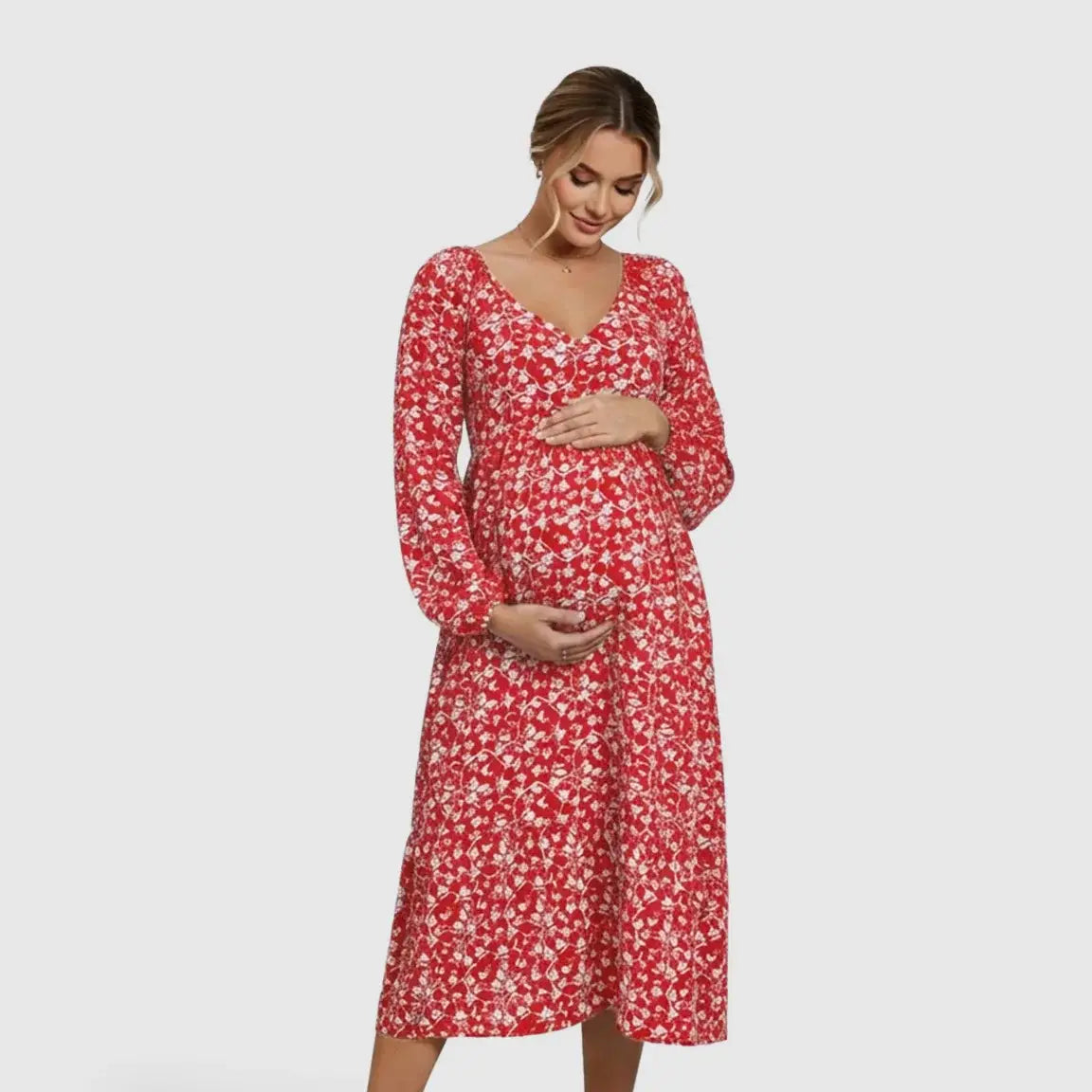 This deep V-neck floral maternity dress is designed with a flowy, bump-friendly silhouette that gives you space to grow without sacrificing style. The lightweight, breathable fabric and long sleeves make it an easy, comfortable choice for appointments and everyday outings, keeping you confident and comfortable through all maternity stages.