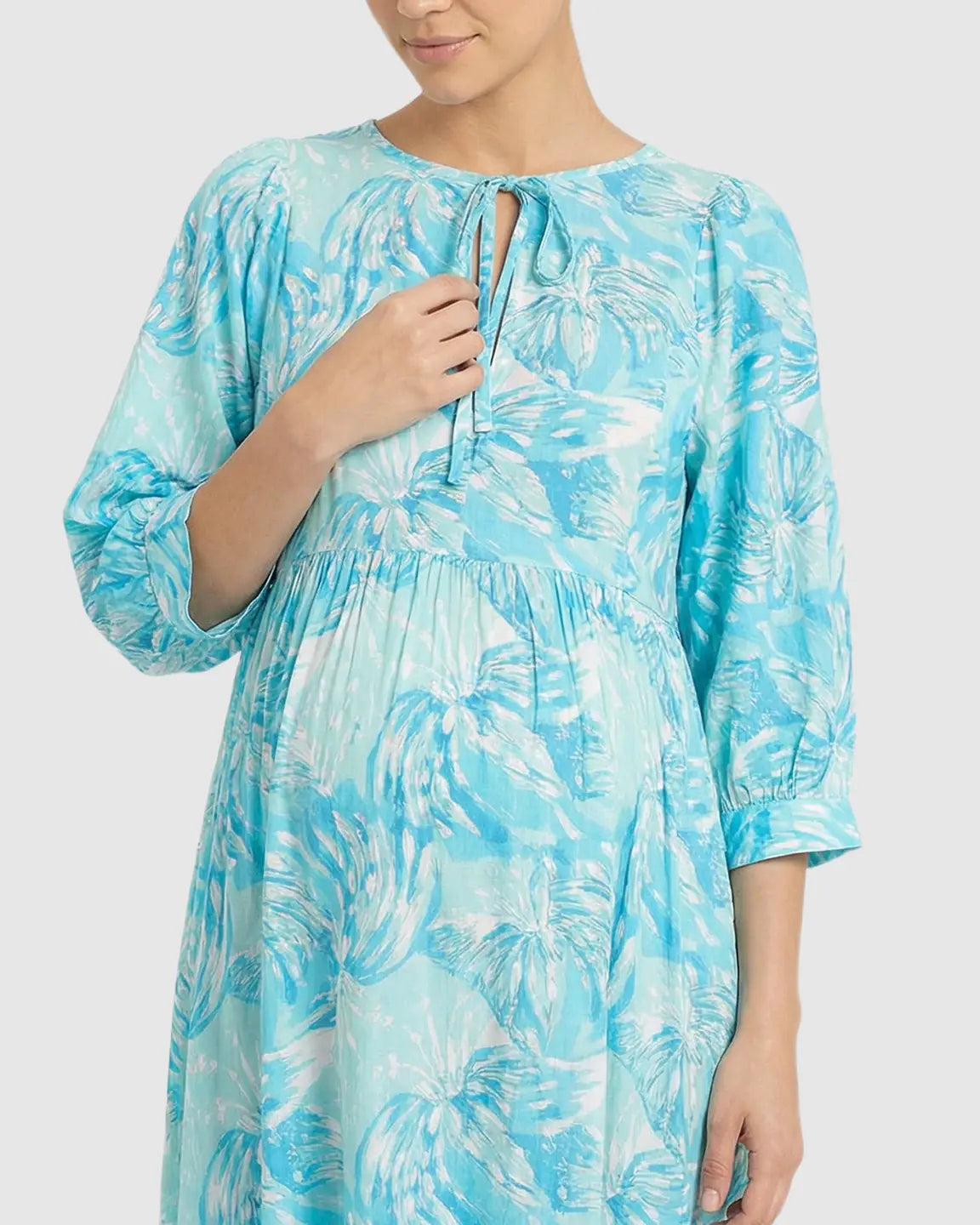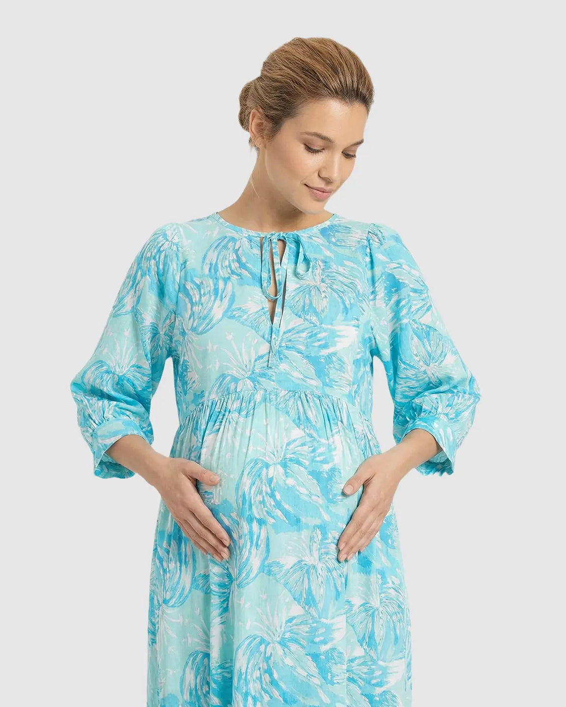 This Cotton Floral Maternity Dress blends bohemian charm with all-day ease. The drawstring keyhole neck adds adjustable elegance, while the gently gathered waist and flowy mid-calf silhouette flatter your bump. Soft, breathable cotton and three-quarter sleeves keep you comfortable for daily outings or casual spring days.