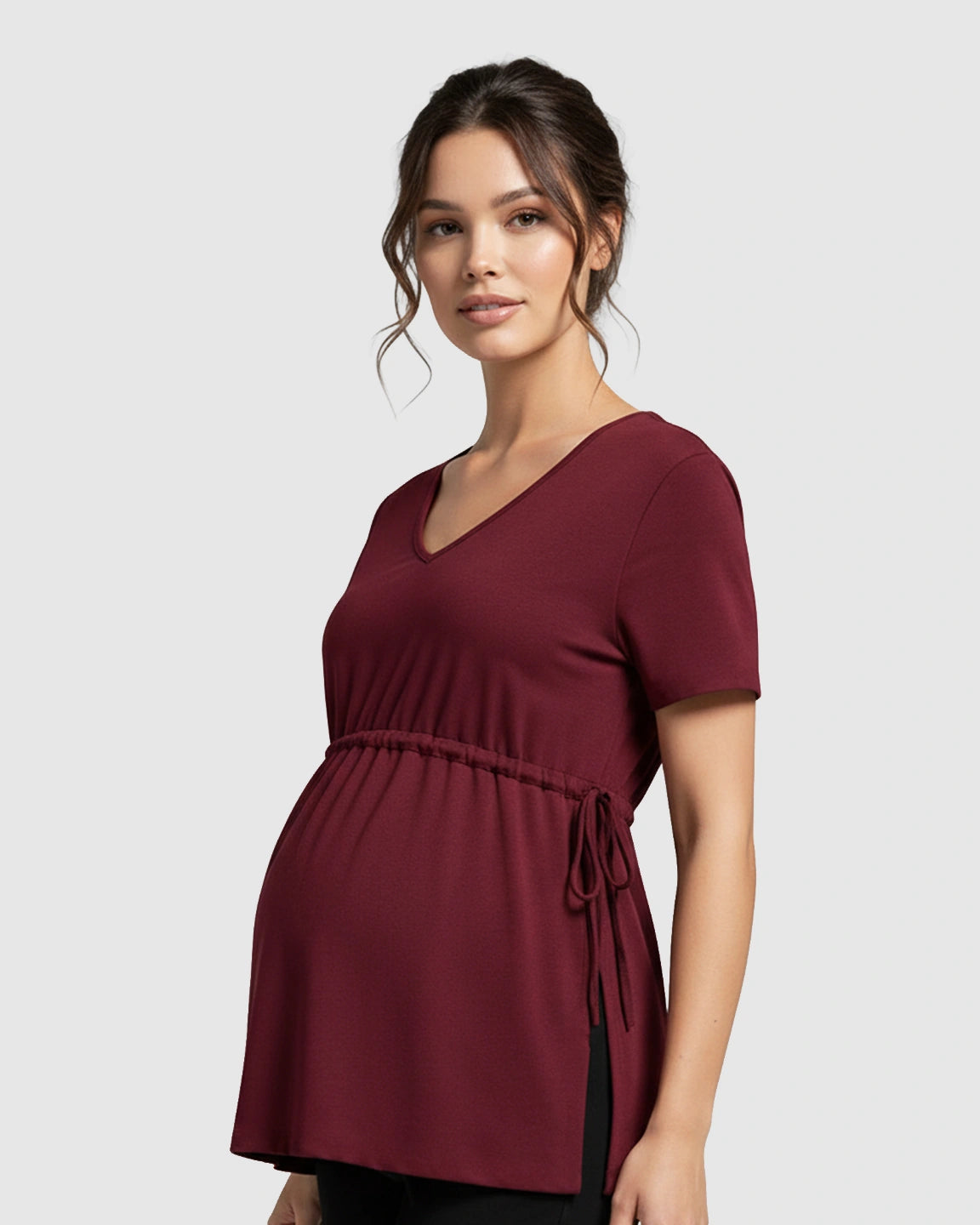 This Elastic-Waist Babydoll Maternity Top adapts to every stage of pregnancy. The V-neck short sleeves and babydoll cut give a loose, flowing fit, while the elastic waistband provides flexible adjustment that flatters your figure.