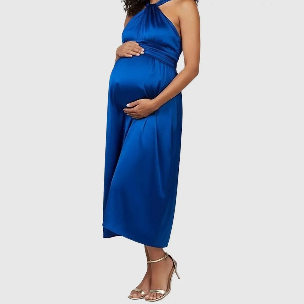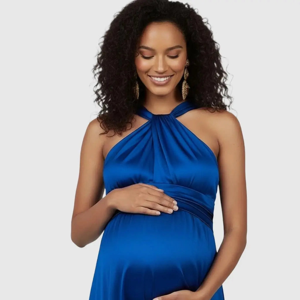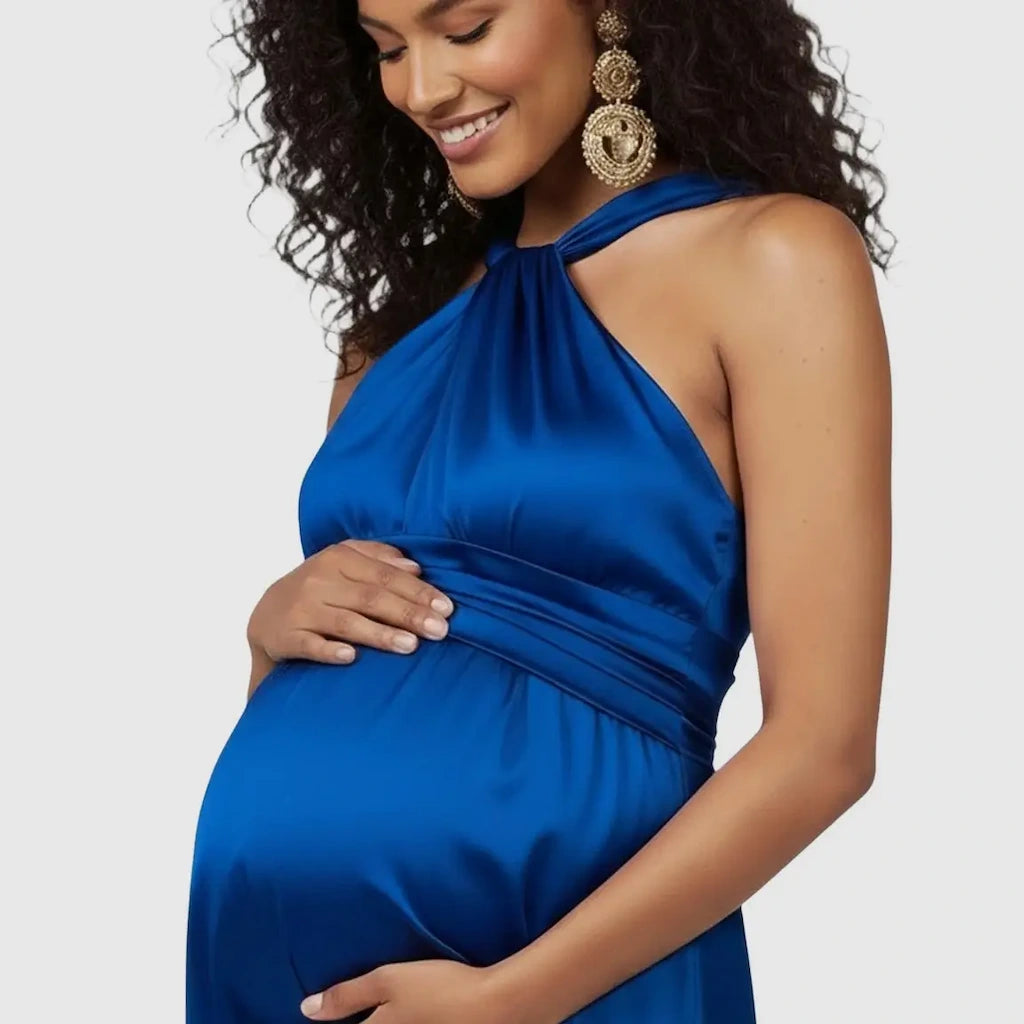 Designed to flatter your changing shape, this maternity dress flows beautifully over your bump, bringing timeless style to every pregnancy milestone. Perfect for baby showers, maternity photoshoots, and formal occasions like weddings or bridal celebrations, it combines elegance with ease. The soft, breathable fabric and halter neckline add a touch of sophistication, while the tie waist detail ensures a perfect fit through every trimester. Feel radiant, feminine, and effortlessly elegant in every moment of pregnancy.