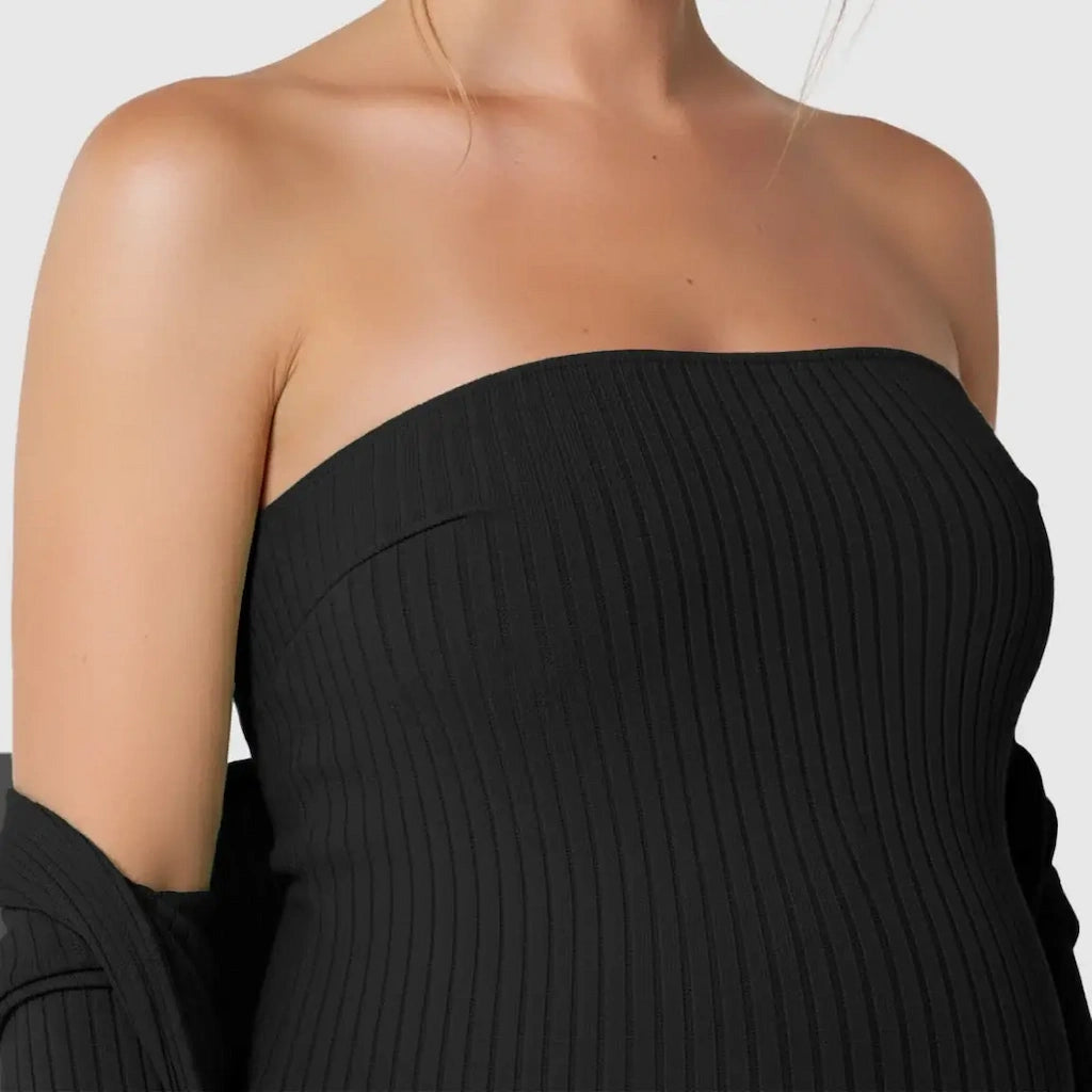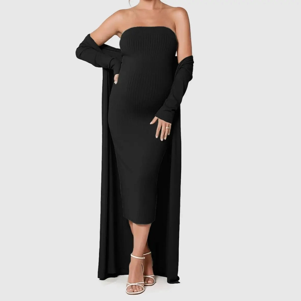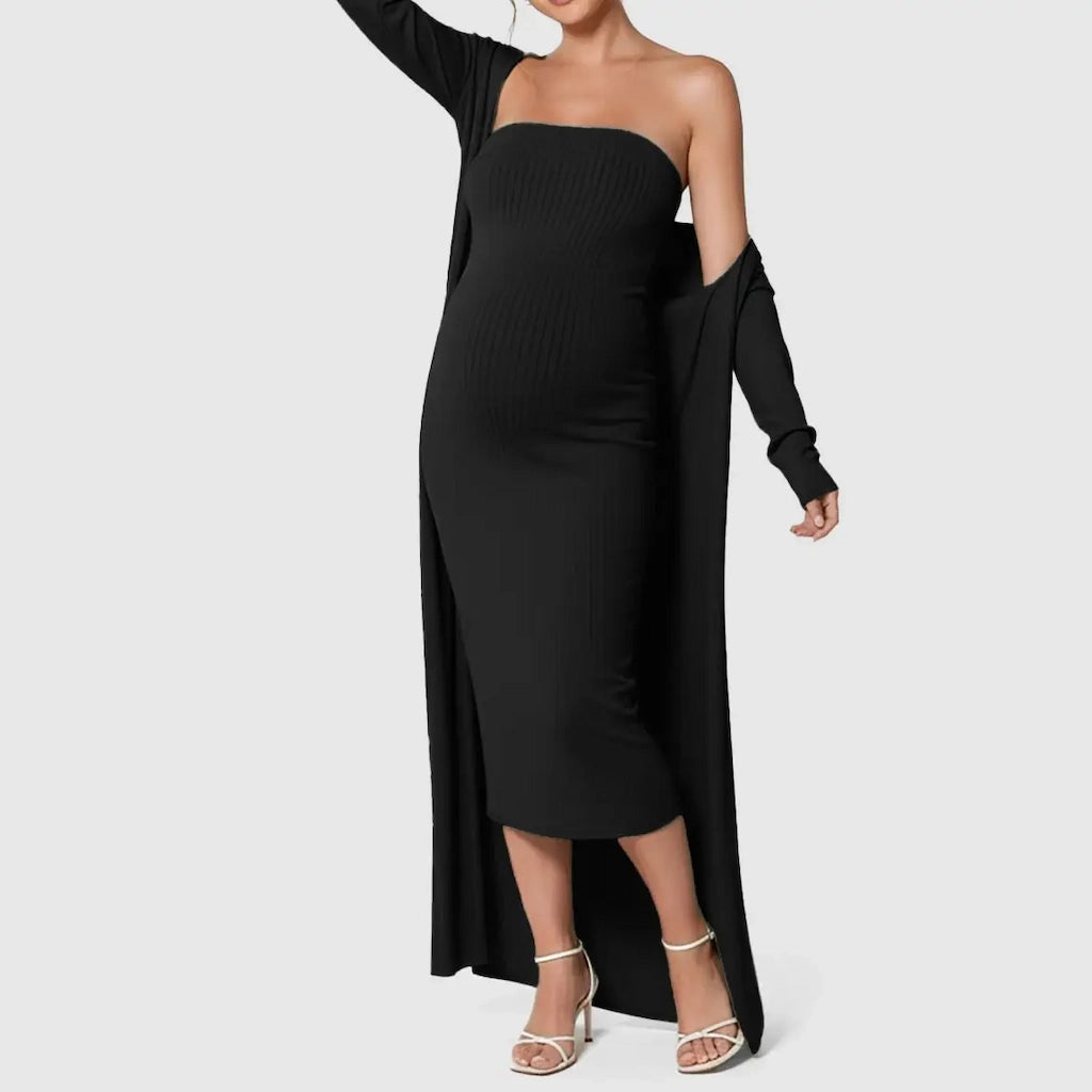 Elegant Ribbed Two-Piece Maternity Dress with Cardigan