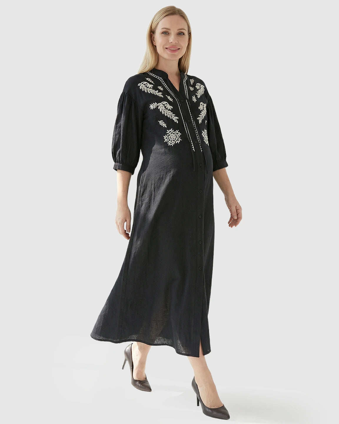 This Embroidered Mandarin Collar Loose Maternity Midi Dress drapes softly with a breathable viscose hemp blend, giving room for your bump without feeling restrictive. The Mandarin collar with V-split and button-down front add retro charm and easy functionality.