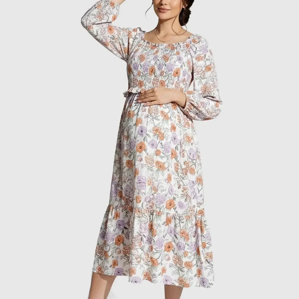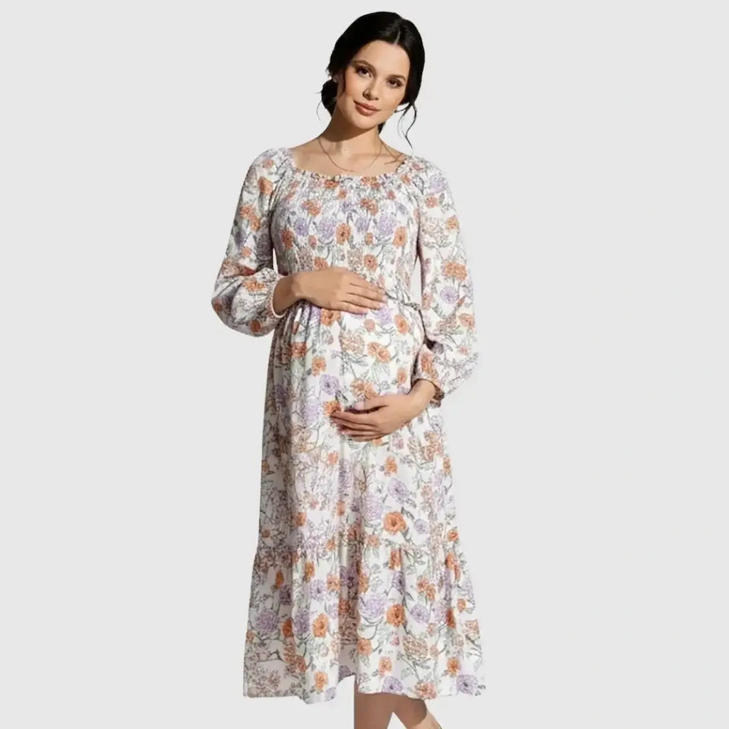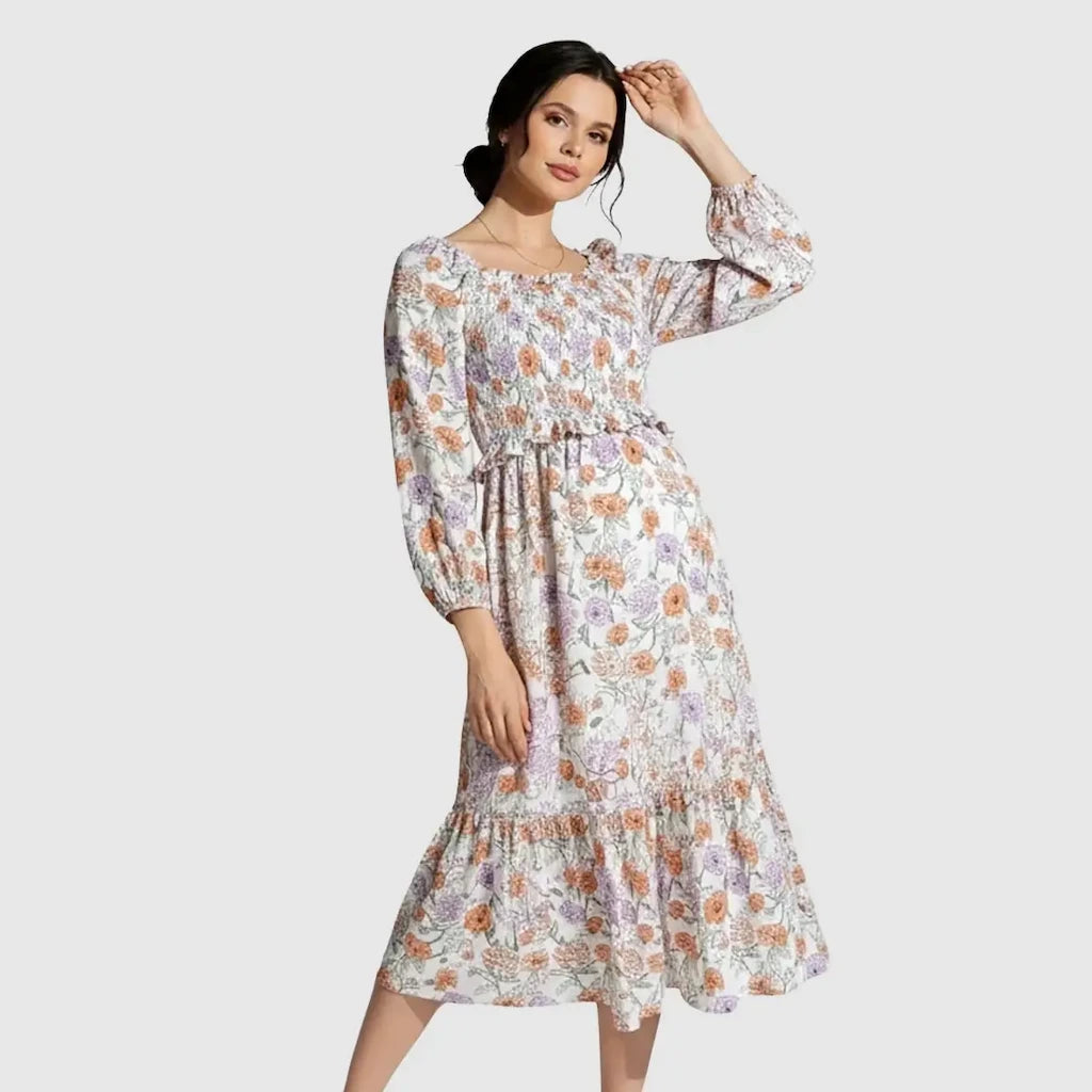 The Floral Print Smocked Bodice Maternity Midi Dress blends effortless comfort with feminine charm. Crafted from lightweight chiffon, it feels soft and breathable against your skin, keeping you cool through every trimester. The smocked bodice stretches gently with your growing bump, while the umbrella skirt design flatters your shape with graceful flow. Perfect for maternity photos, brunches, and baby showers.
