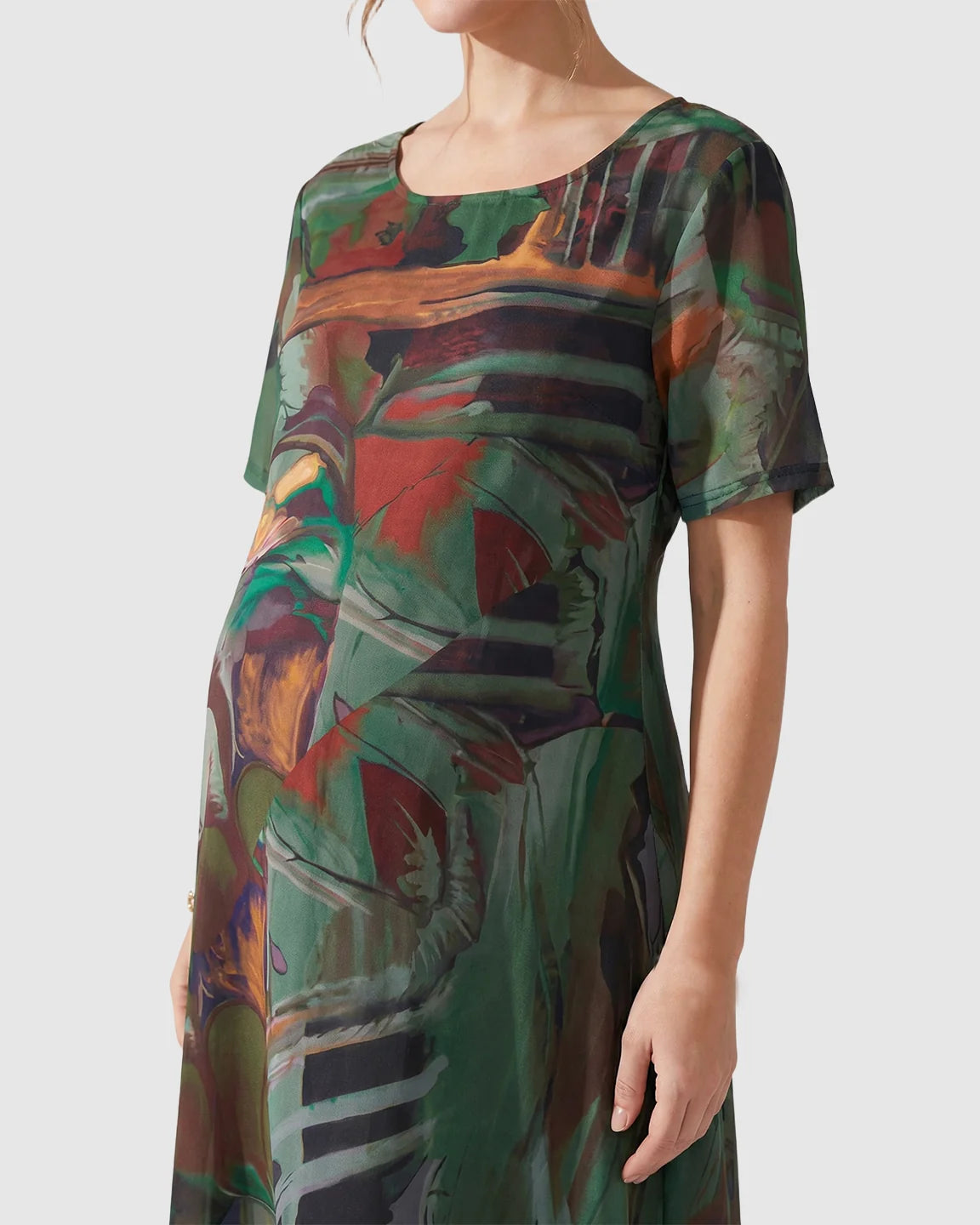 An abstract print midi dress with a relaxed A-line shape that flatters your bump, your body, and your mood.