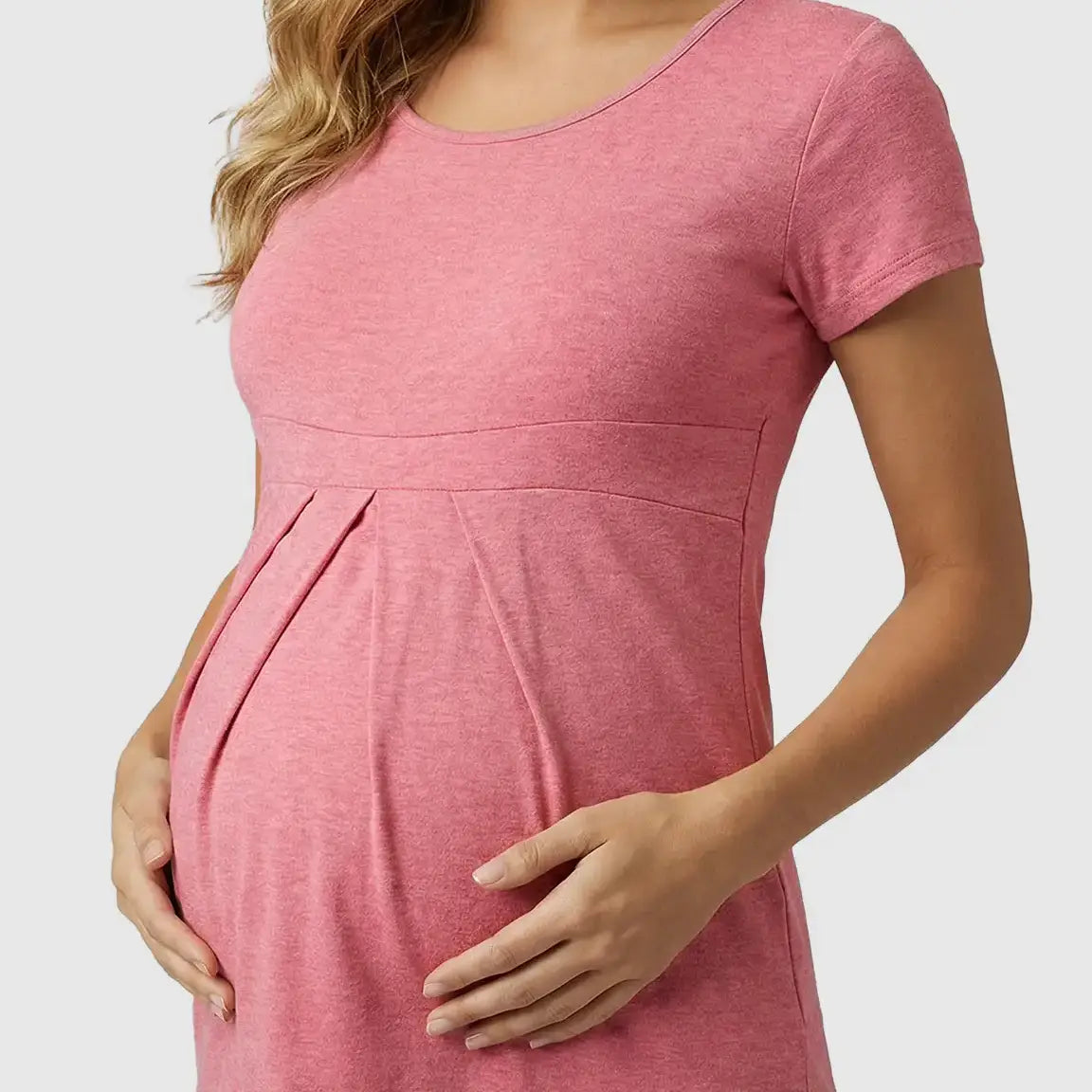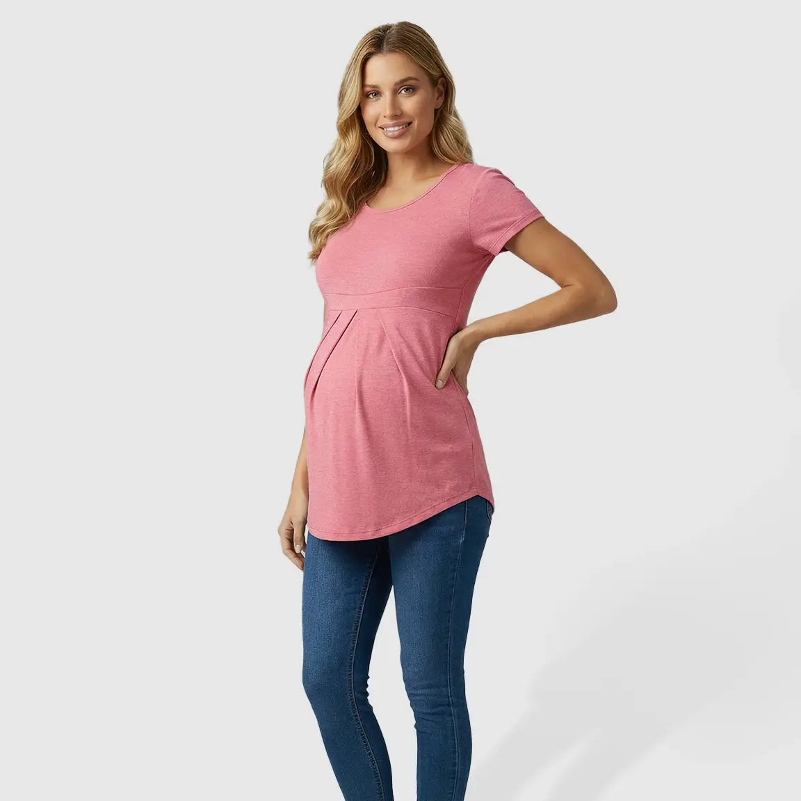 Meet the Elegant Gathered Empire Waist Maternity Top, designed with gentle pleats that expand with your growing bump while draping beautifully over your curves. The stretchy, breathable fabric keeps you comfortable all day, and the curved hem offers extra coverage without feeling heavy. Perfect for maternity and early postpartum, it gives you an effortless, put-together look for home, errands, or casual days out.