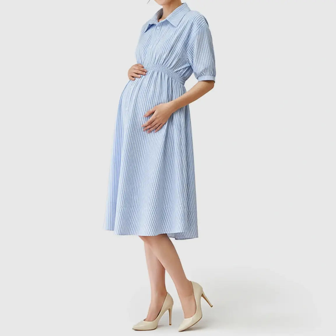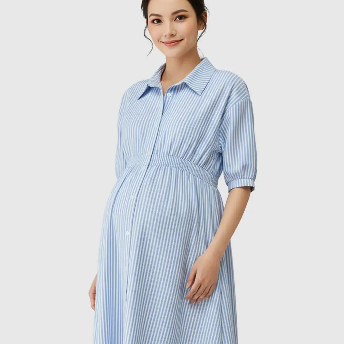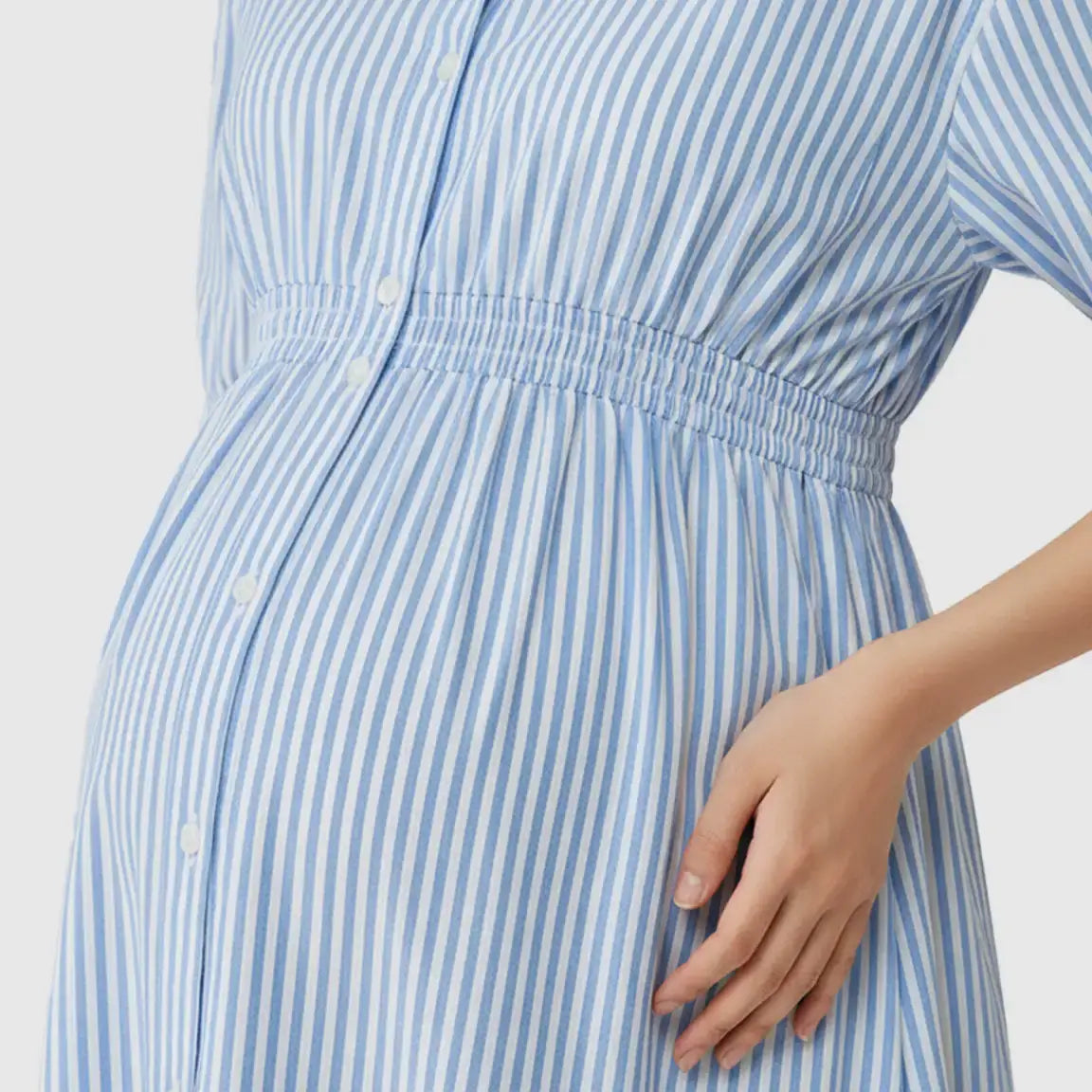This soft, lightweight striped shirt dress is designed with a stretchy gathered waist that grows with your bump while keeping you feeling supported and free to move. The classic button-front and clean collar bring a polished, effortless look you can wear anywhere, from errands to office days to relaxed weekends. Perfect for warm weather, this breezy A-line maternity dress gives you the comfort and confidence you need, every single day of pregnancy.