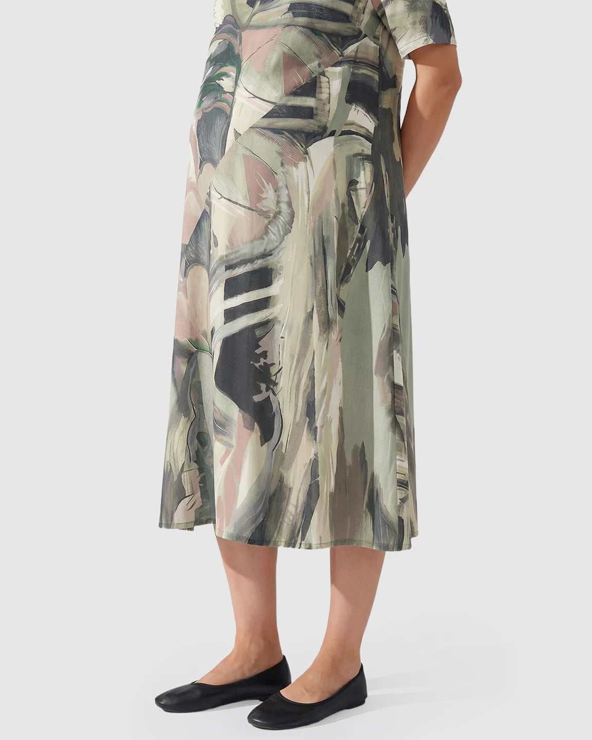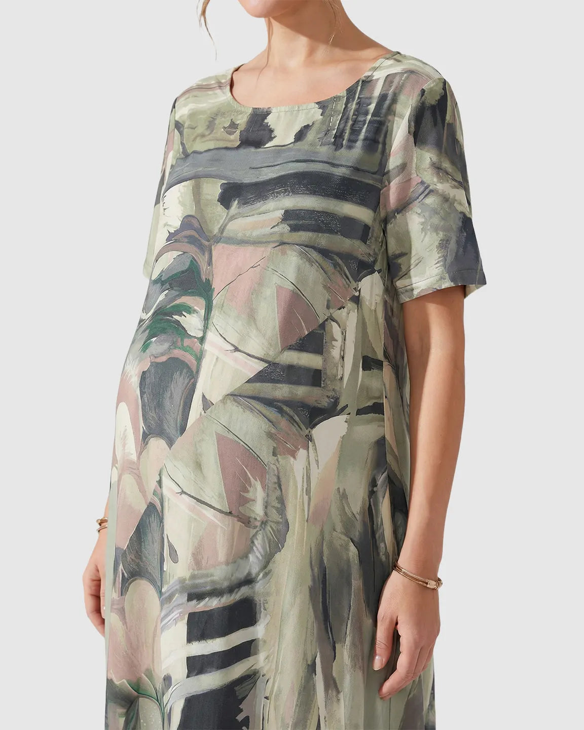 A short sleeve midi with a soft, flowy A-line shape that gives you room to grow and move freely.