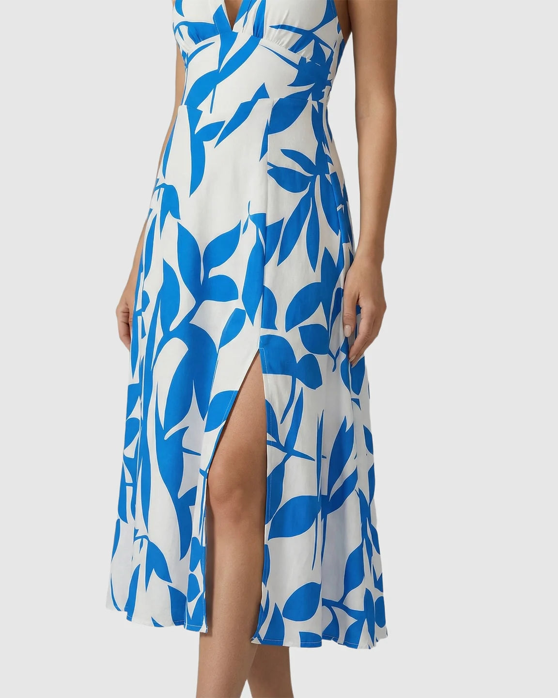 This Halter Neck Midi Dress flows beautifully over your bump with a high-waisted A-line skirt and side slit design for easy movement. The sleeveless style and deep V-neck keep you breezy and flattering.