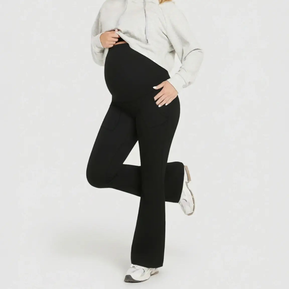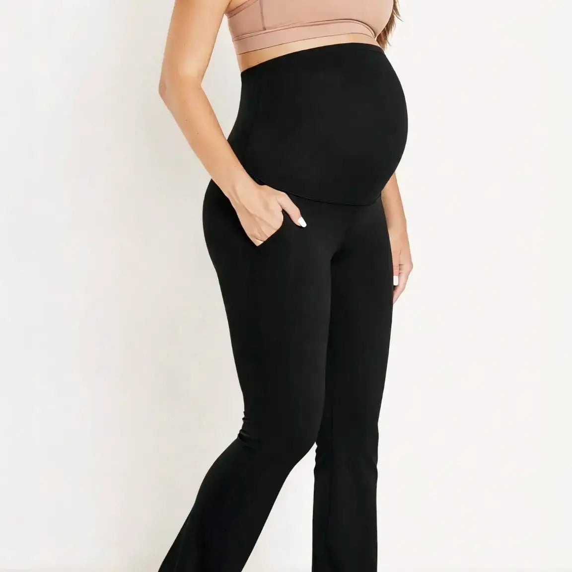 Stay comfortable and stylish in the High-Waist Pocketed Flare-Leg Maternity Leggings. Made from soft, stretchy fabric, these bump-friendly maternity leggings move with your growing belly while offering all-day comfort. The flared silhouette flatters every figure, and convenient side pockets keep essentials close. Perfect for workouts, errands, or lounging at home, these maternity leggings are a versatile must-have for pregnancy and beyond.