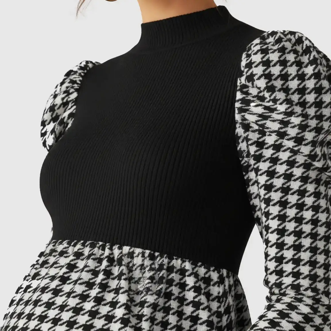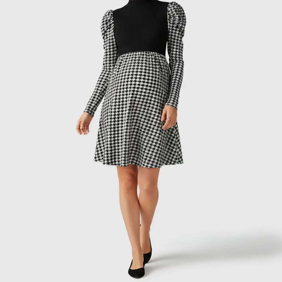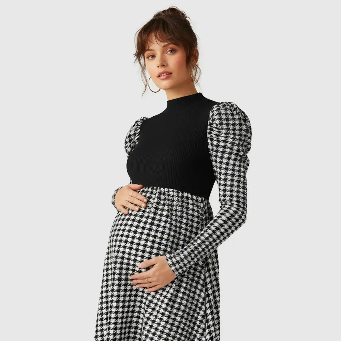 This elegant maternity short dress pairs a stretchy black knit bodice with a classic houndstooth skirt, giving you a balanced, bump-friendly fit that flatters your changing shape. With sweet puff sleeves and a cozy autumn/winter design, it styles effortlessly with your favorite jacket and boots for an elevated, everyday maternity look.