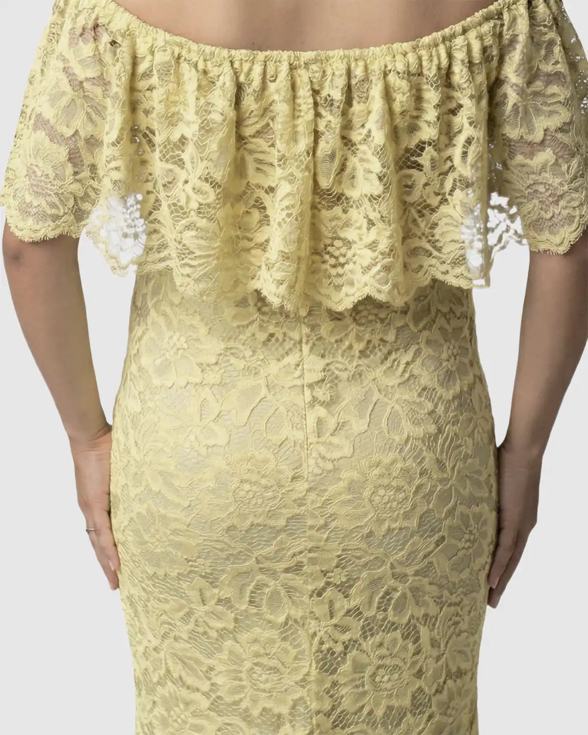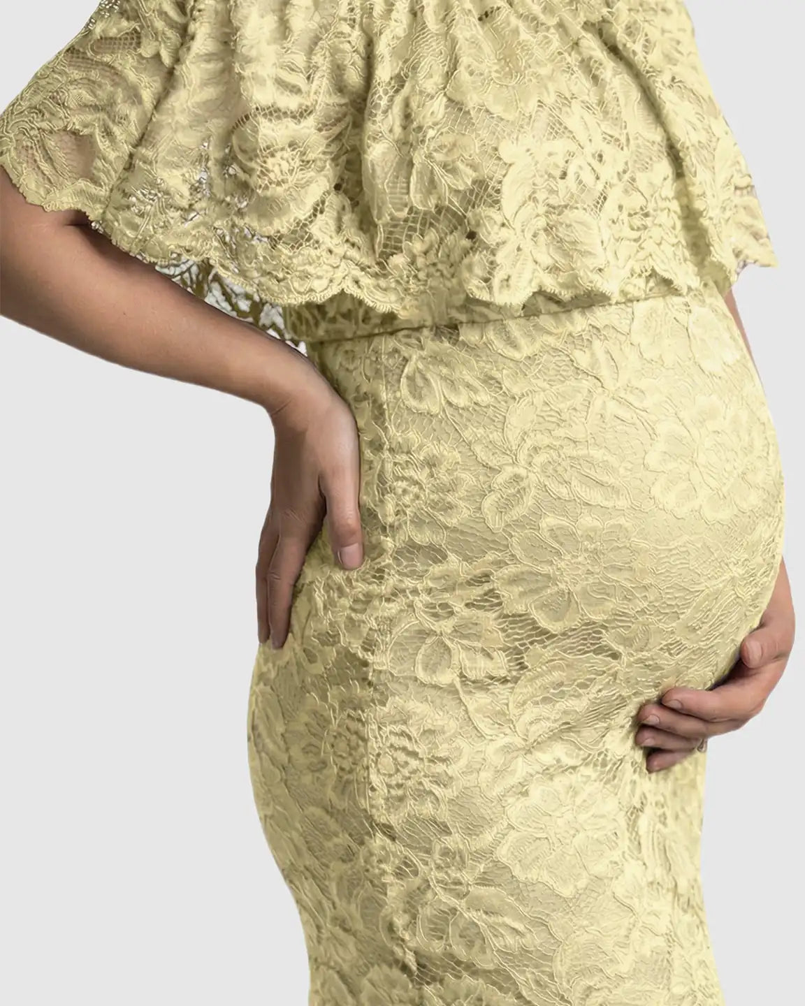 The Lace Fitted Mermaid Maternity Gown gives you a curve-hugging, romantic silhouette with an off-shoulder ruffle top and flowing mermaid skirt.