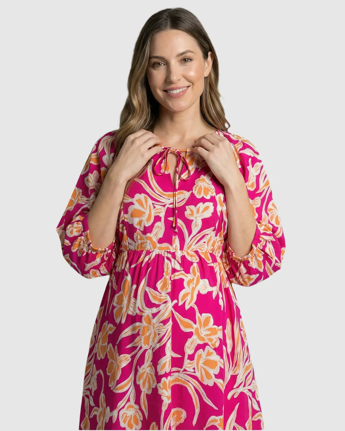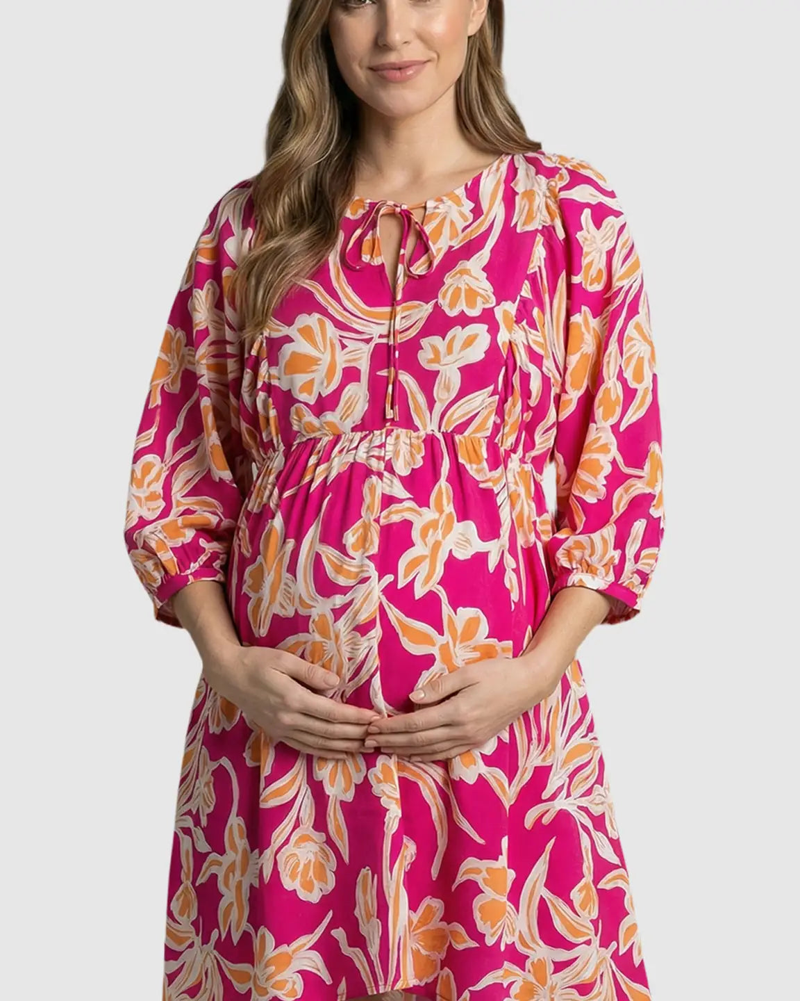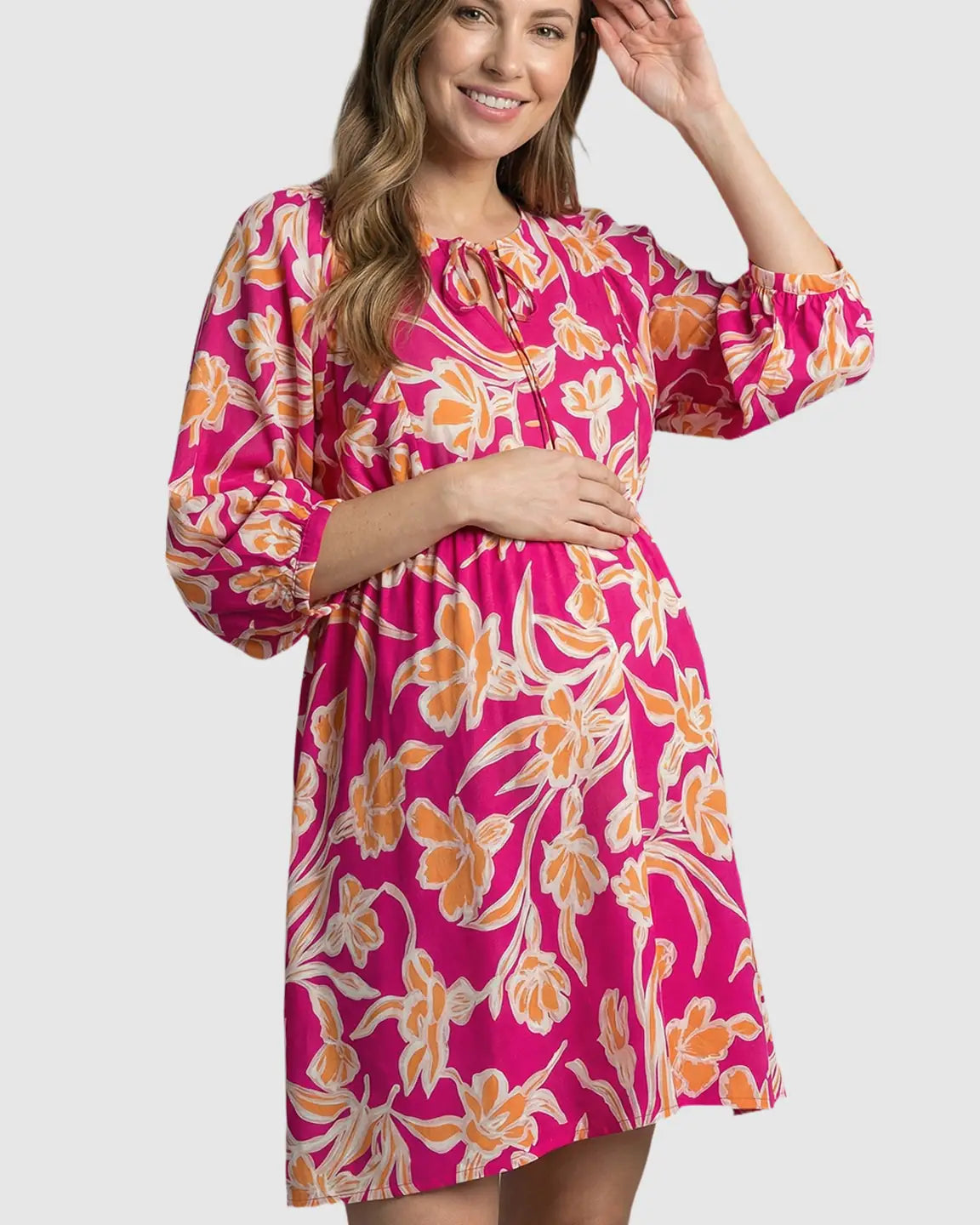 This loose fit maternity dress flows gently over your bump, giving you room to move and stay comfortable through every trimester. The nine-point lantern sleeves add a cute, airy touch, while the tie-front detail and empire waist create a flattering silhouette that adjusts with your changing shape.