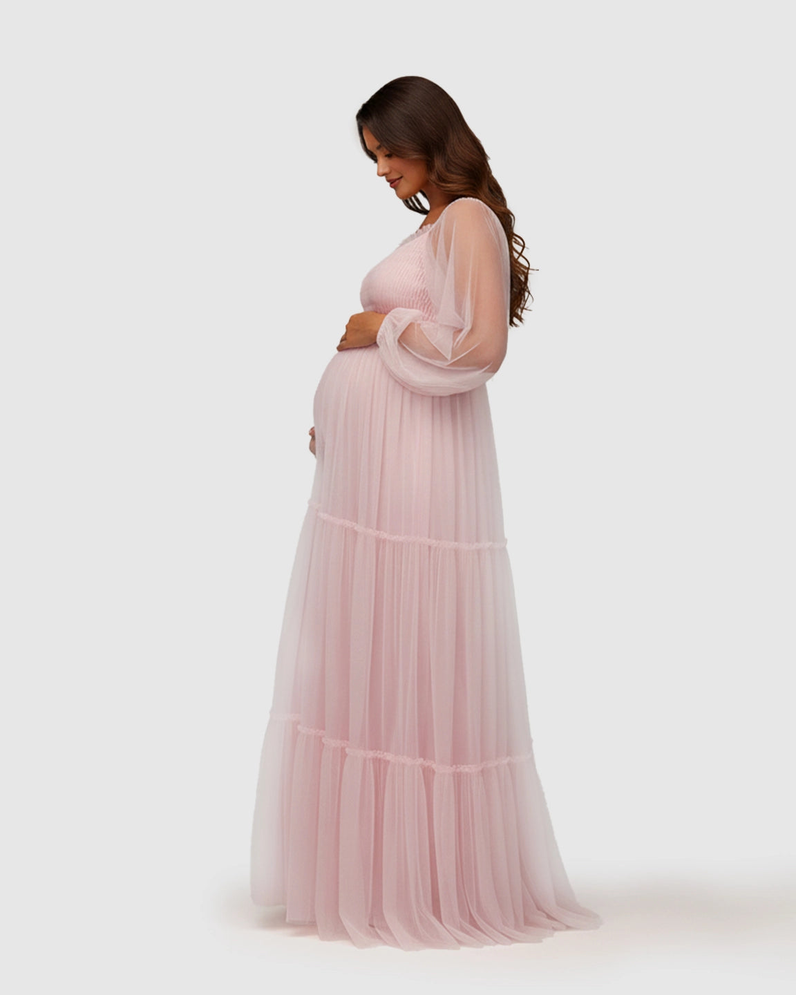 Lantern-Sleeve Tiered Tulle Maternity Photoshoot Gown