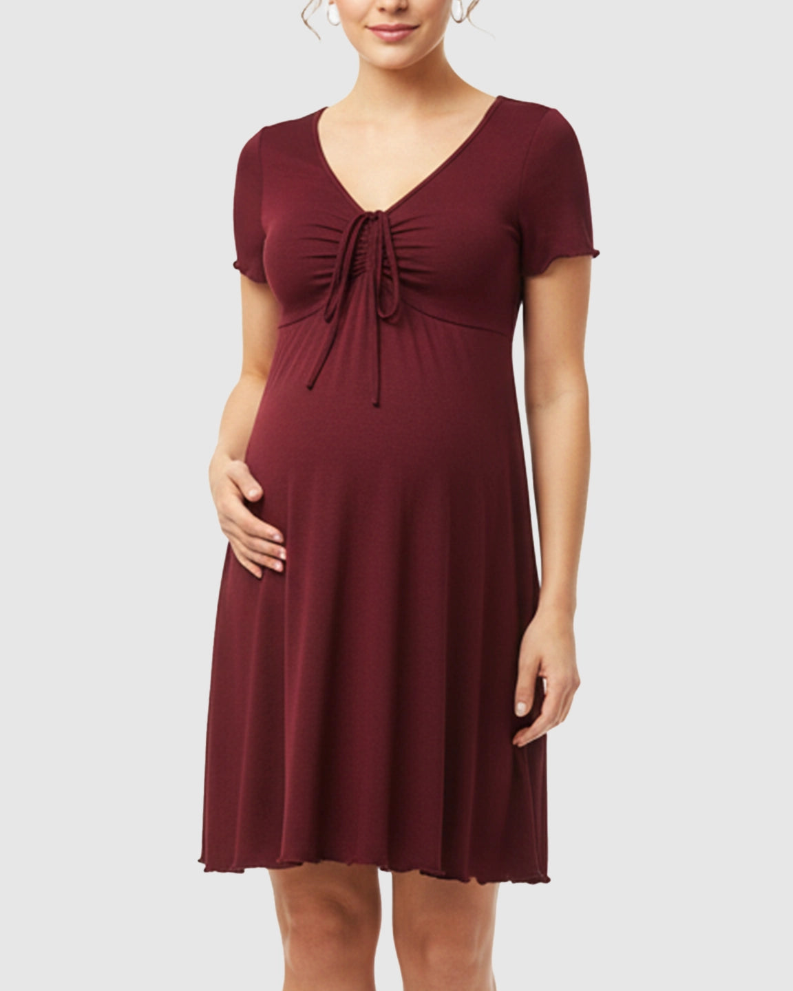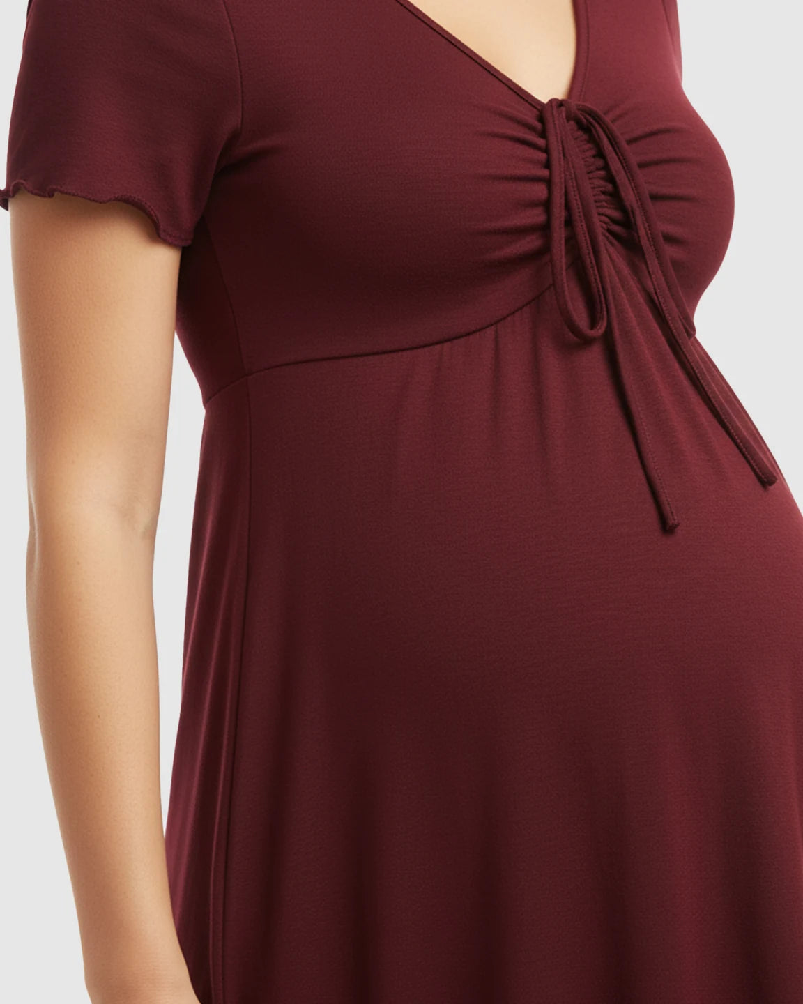 The Lettuce Edge Hem Casual Maternity Mini Dress is your go-to for day-to-day outings and light social occasions. Soft, skin-friendly polyester drapes beautifully over your bump, while the drawstring V-neck lets you adjust for comfort and a flattering fit. Casual short sleeves with delicate lettuce-edge hems add a playful, feminine touch, and the empire waist gently defines your shape without feeling restrictive.