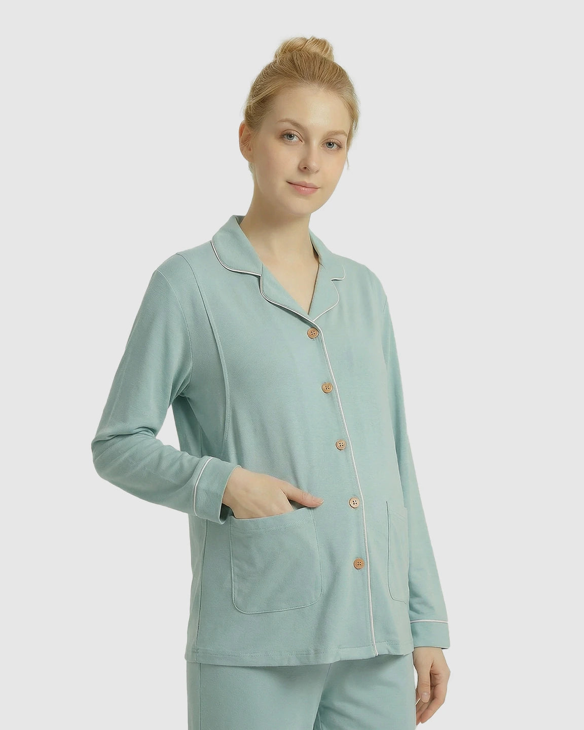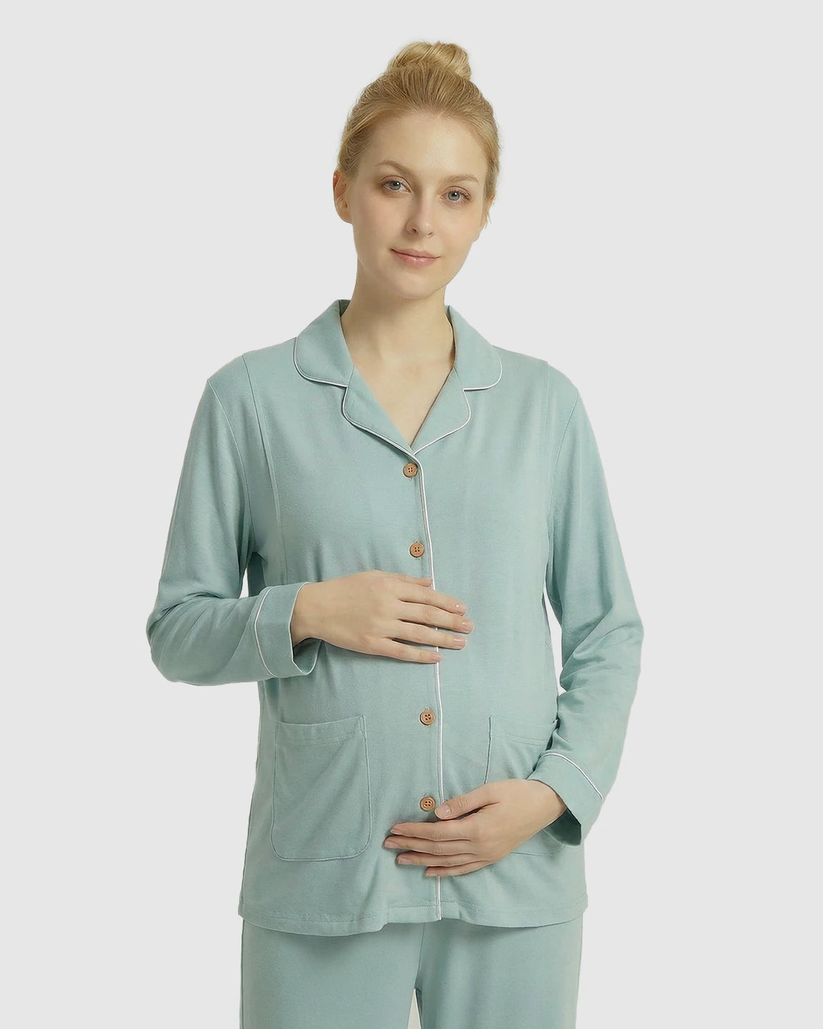 The Lift-Up Flap Nursing Access Minimalist Maternity Sleepwear wraps you in soft, breathable cotton blend postpartum comfort. Its long sleeve sleepwear set features a button-front loungewear top with a concealed lift-up flap for easy nursing, plus a minimalist notched collar and relaxed fit pants with front pockets.
