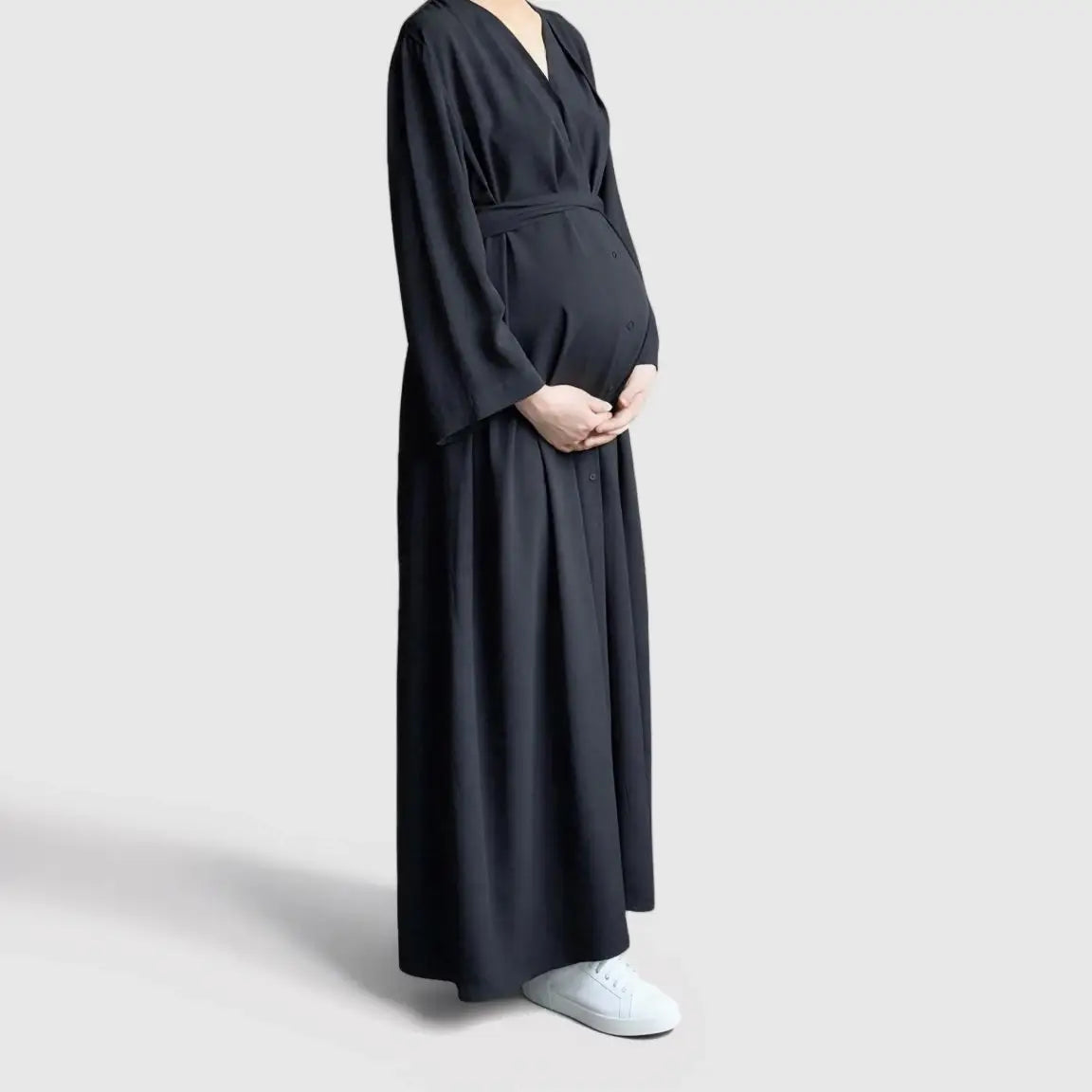 The Long Sleeve V-Neck Maternity Maxi Dress with Adjustable Waist is designed to grow with you and flatter at every stage. Its soft, flowy drape moves effortlessly with your body, while the tie belt gently defines your shape through pregnancy and postpartum recovery. Whether you’re relaxing at home or stepping out, it’s the dress that helps you feel like yourself again — comfortable, elegant, and effortlessly put-together.