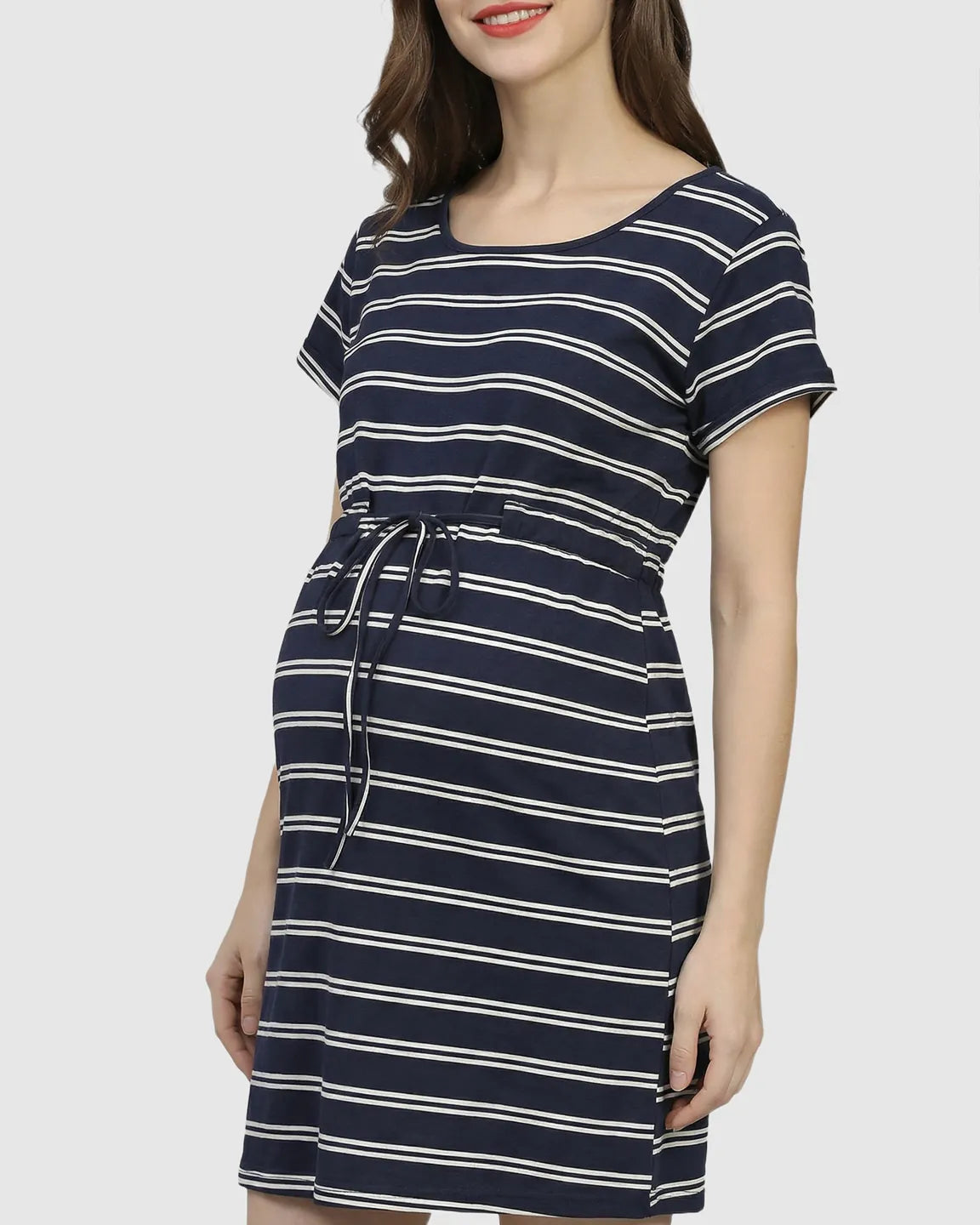 This striped, short sleeve maternity dress is designed to move with you through every trimester and postpartum. The boat neckline and straight fit give a classic, flattering silhouette, while the adjustable drawstring waist lets you customize your fit for bump or postpartum comfort.