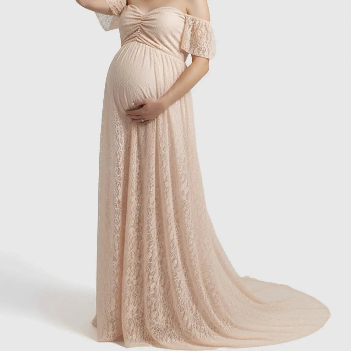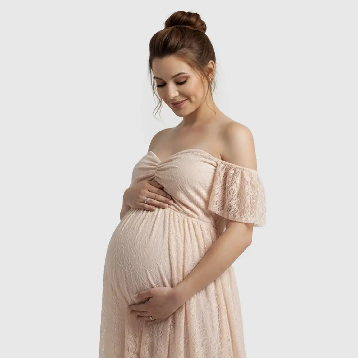 This dress combines a dreamy off-shoulder neckline with a flowing lace maxi silhouette for a soft, elegant look. The lace detailing and gentle drape create a romantic feel that flatters your bump beautifully. Perfect for photoshoots and special maternity moments.