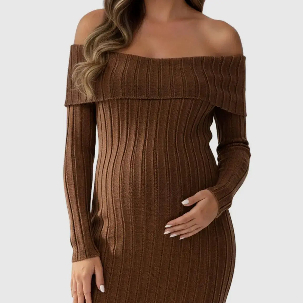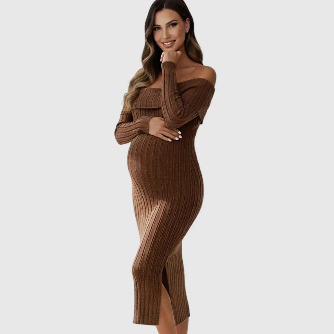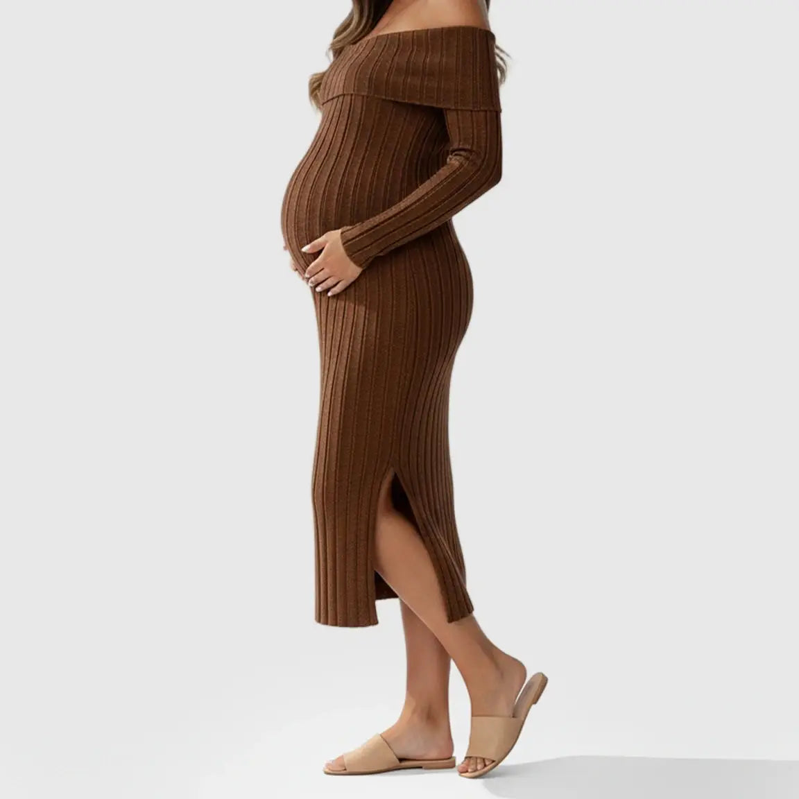 Off Shoulder Ribbed Knit Maternity Midi Dress
