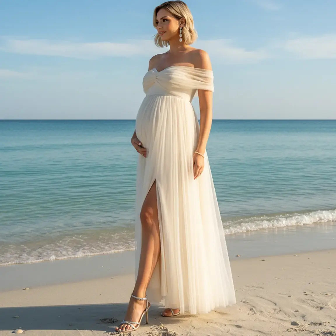 With its dreamy off-shoulder neckline, flowing silhouette, and dramatic high slit, this gown creates movement, elegance, and unforgettable portraits. Lightweight, airy, and beautifully draped, it flatters your bump from early pregnancy through late-stage maternity, helping you look effortlessly radiant in studio or outdoor sessions.