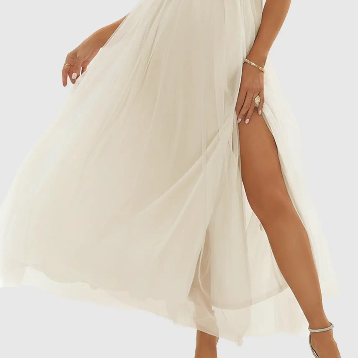 A dramatic slit that adds shape, motion, and elegance, perfect for walking shots, twirls, and soft wind movement.