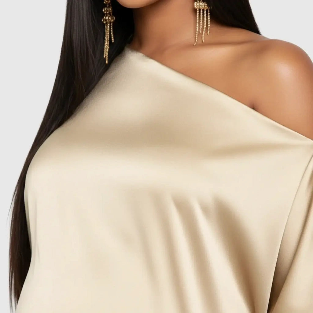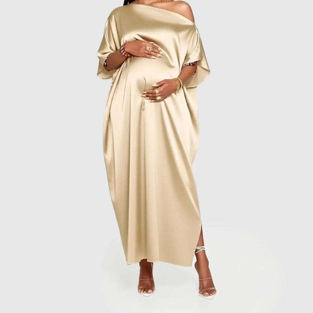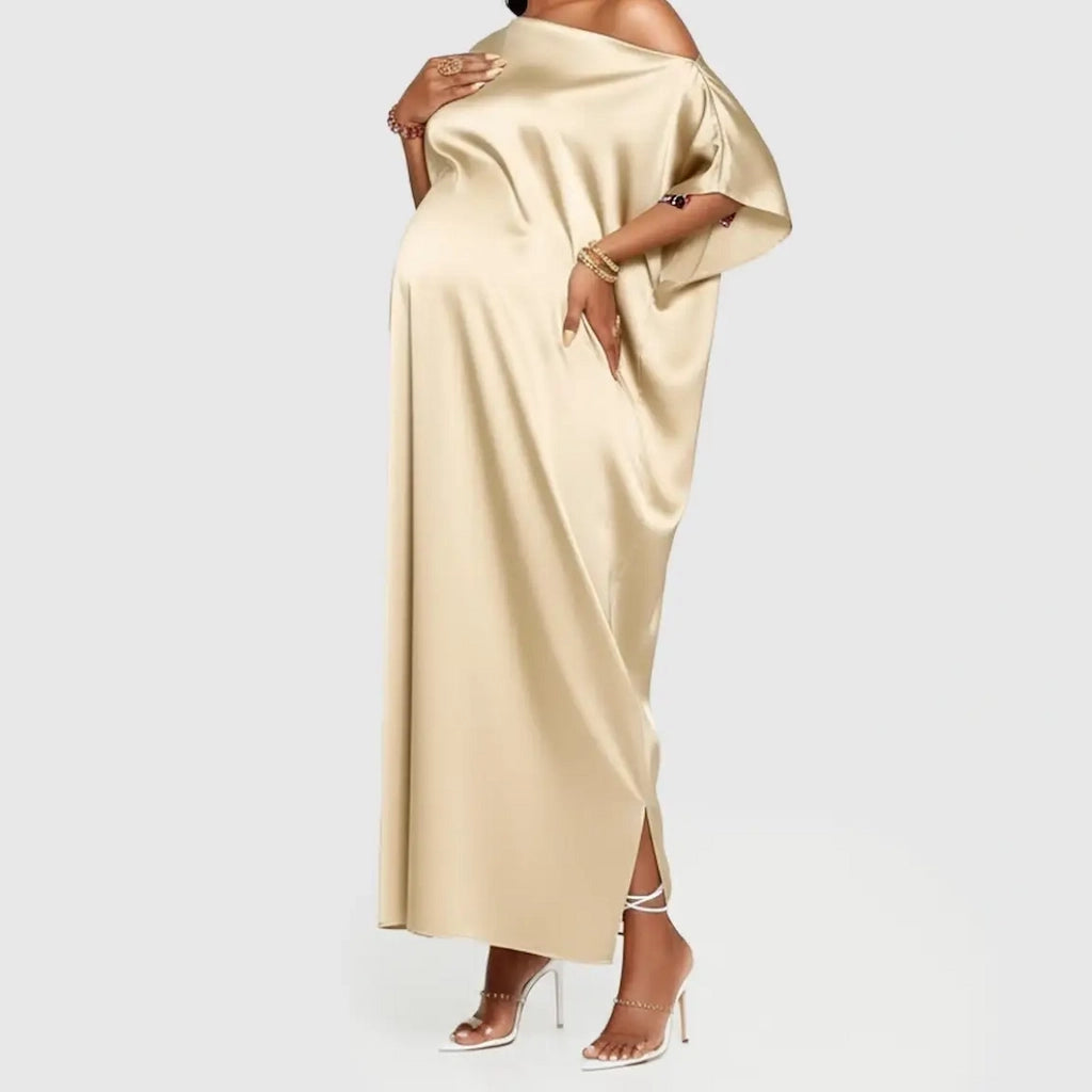 Step into effortless elegance with this one-shoulder, floor-length maternity maxi dress, designed to move with your body while flattering your beautiful bump. Its smooth satin fabric with gentle stretch ensures all-day comfort while keeping you polished for formal occasions or office wear. Featuring a one-shoulder oblique collar, batwing sleeves, and a side slit, this dress is perfect for maternity wear—from early to late pregnancy.