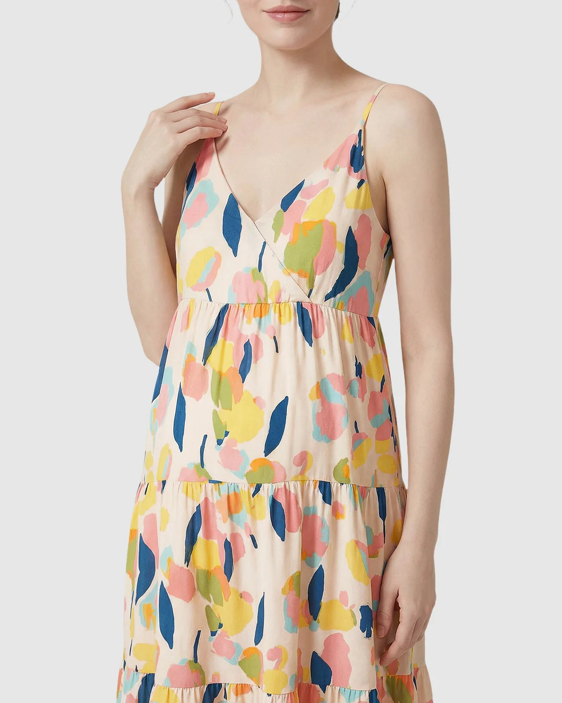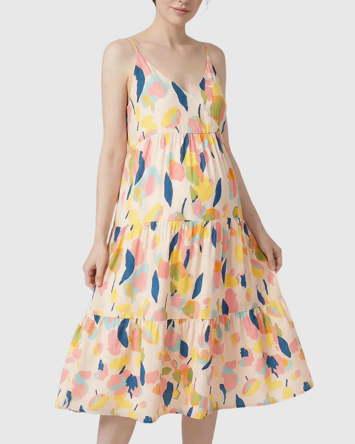 Long, lightweight straps and a flowing tiered ruffle midi skirt create a feminine, effortless silhouette made for sleep, quiet lounging, or gentle postpartum moments.