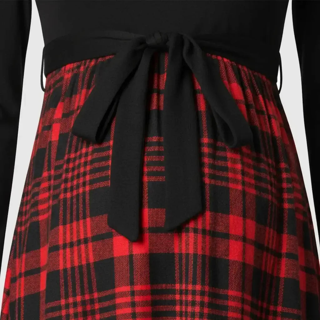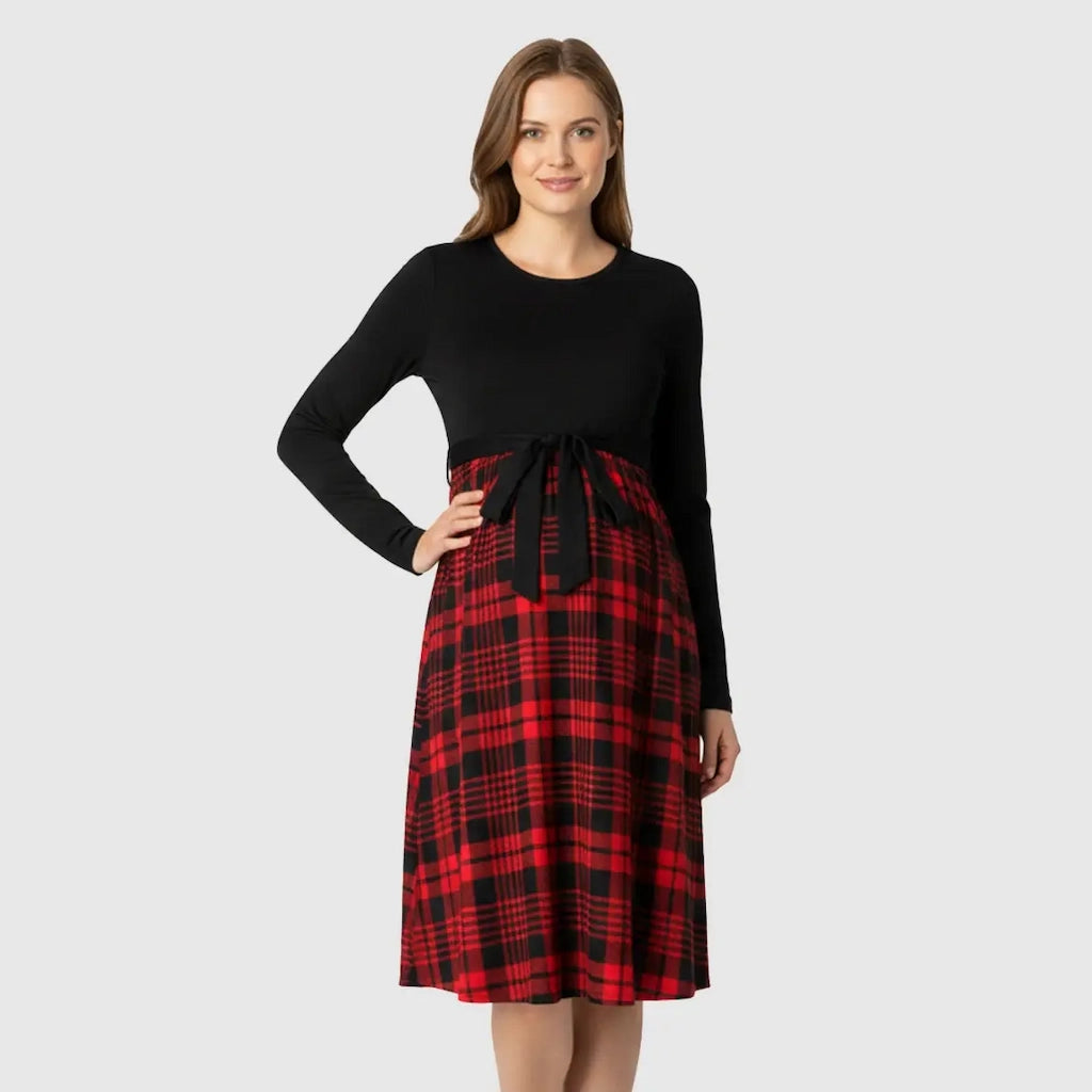 Plaid High-Waist Long Sleeve Nursing Maternity Dress
