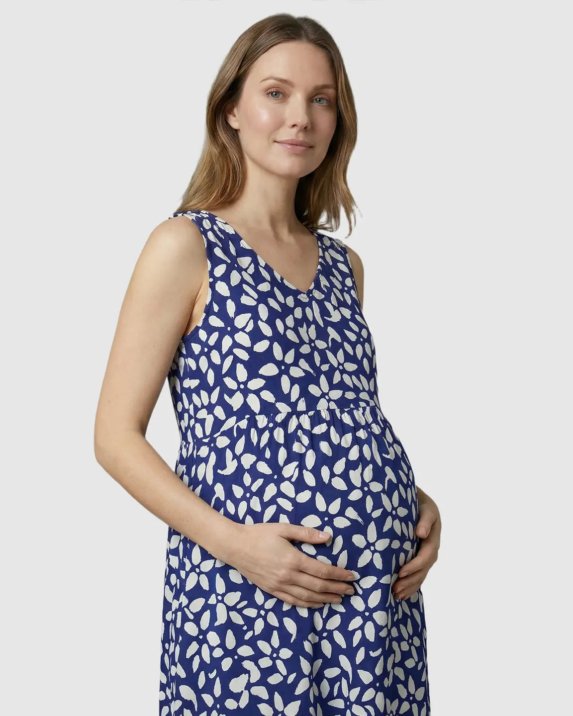 The Pockets V-Neck A-Line Maternity Midi Dress gives you a breezy cotton-blend fit with a flattering sleeveless V-neck and a flowy A-line silhouette.