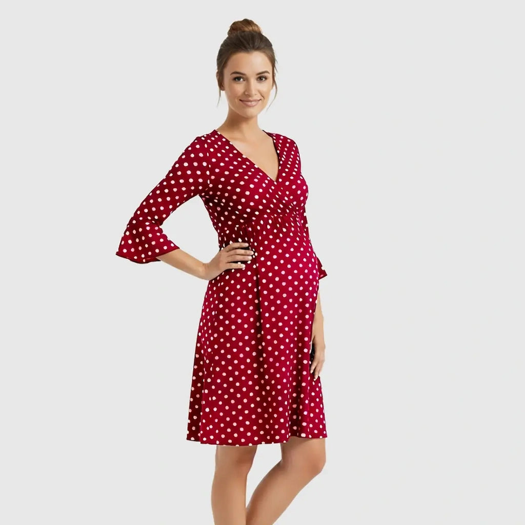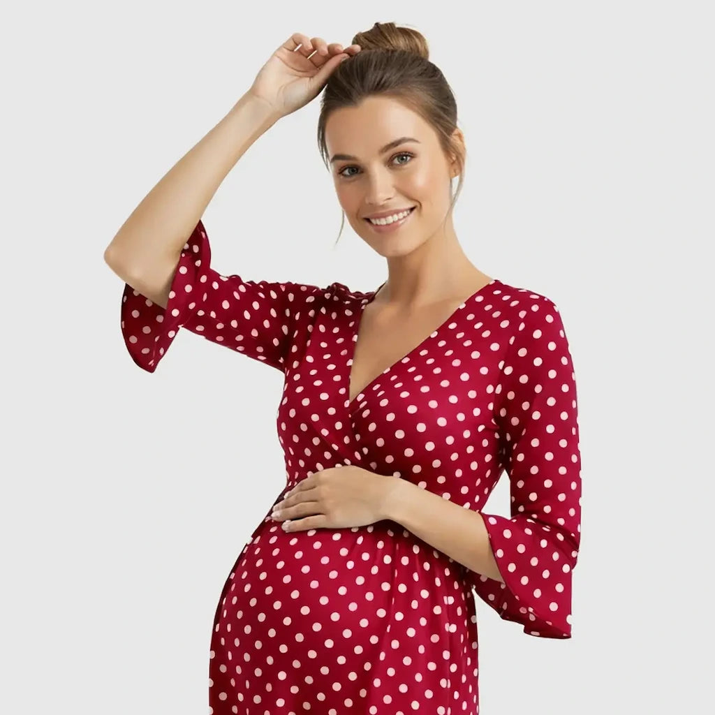 This Polka Dot Empire Waist Maternity Short Dress is your go-to for effortless style with zero fuss. The soft, stretchy fabric drapes beautifully over your bump while the empire waist gives you shape without pressure. With a playful retro print and a flattering V-neck, it's made to help you feel confident from the first trimester all the way through late pregnancy.