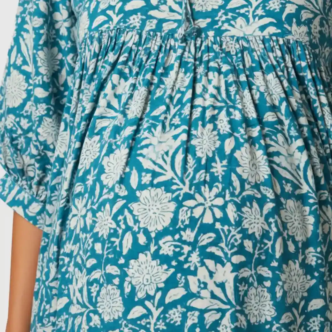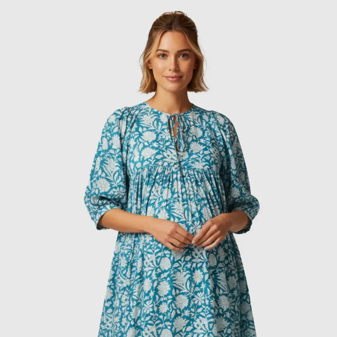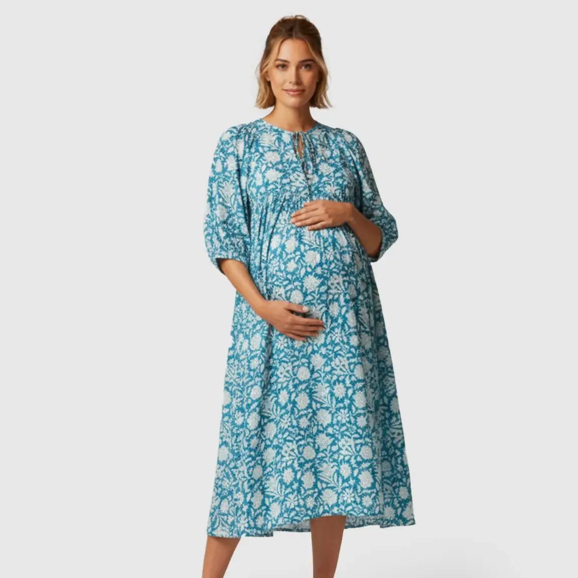 This Puff-Sleeve Bohemian Maternity Midi Dress is made from soft, breathable cotton that keeps you cool and comfortable all day. The flowy silhouette, gathered details, and gentle waist shape flatter your changing body without clinging, perfect for pregnancy, postpartum, and pre-pregnancy comfort. With its airy puff sleeves and artisanal floral print, this is your go-to dress for everyday outings, special moments, and everything in between.
