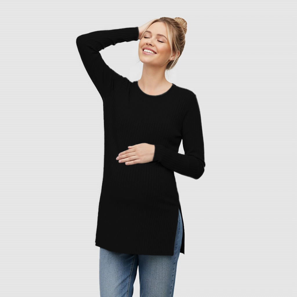 This ribbed knit long-sleeve design adapts beautifully as your belly grows, offering gentle flexibility without ever feeling tight. The mid-length silhouette and side slits make everyday movement effortless, while the clean crew neckline keeps your look simple and polished. Easy to pair with your favorite maternity jeans, this is the kind of staple you'll reach for throughout every stage of pregnancy.