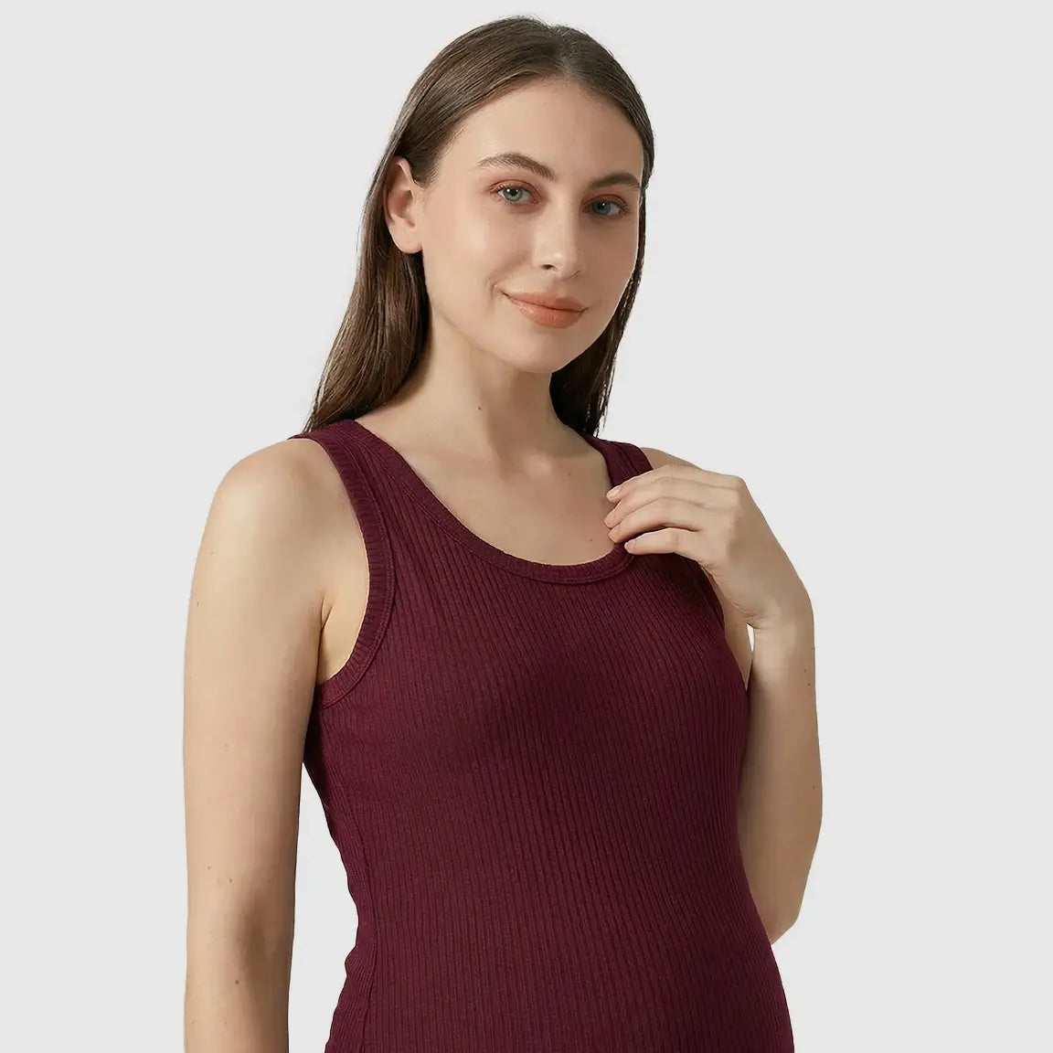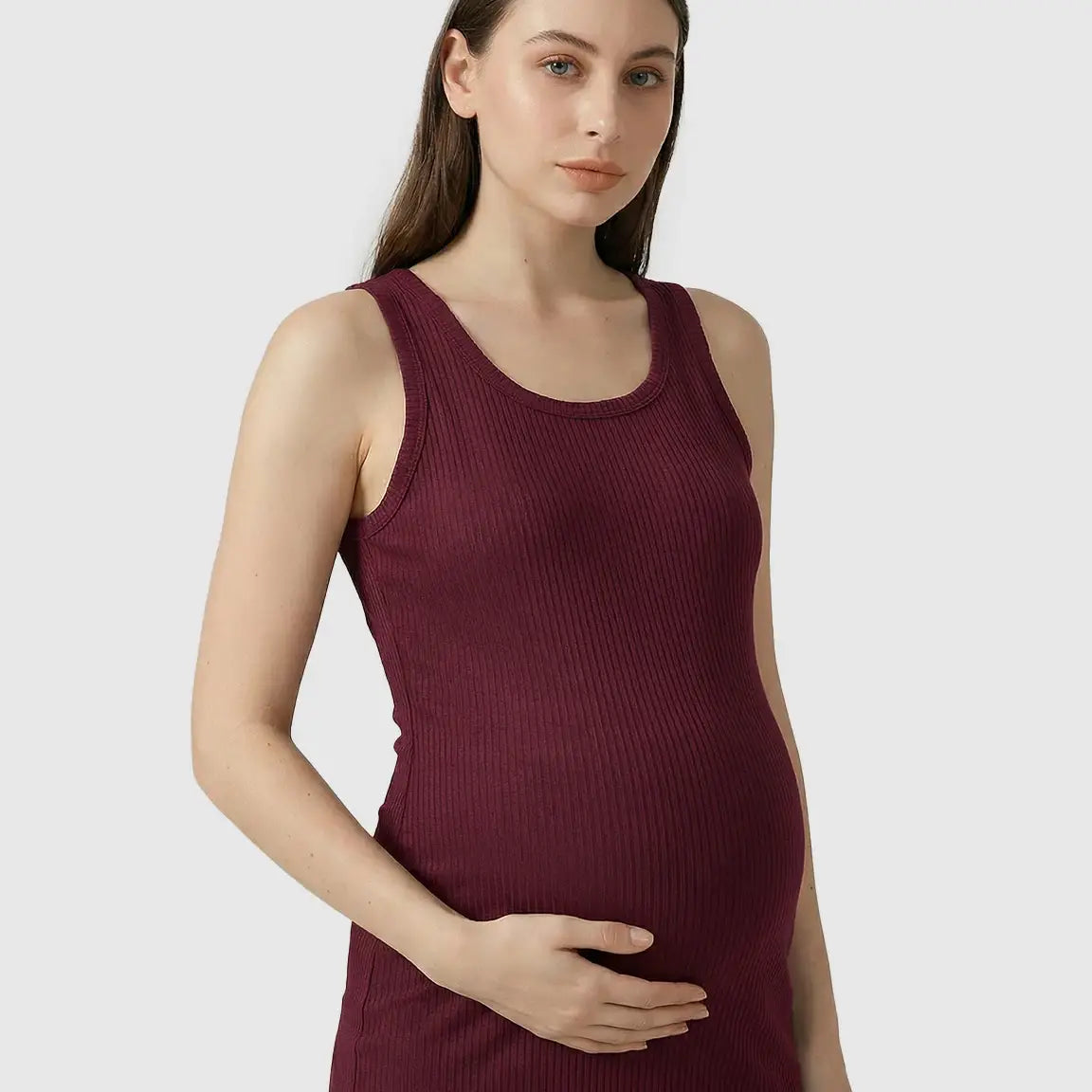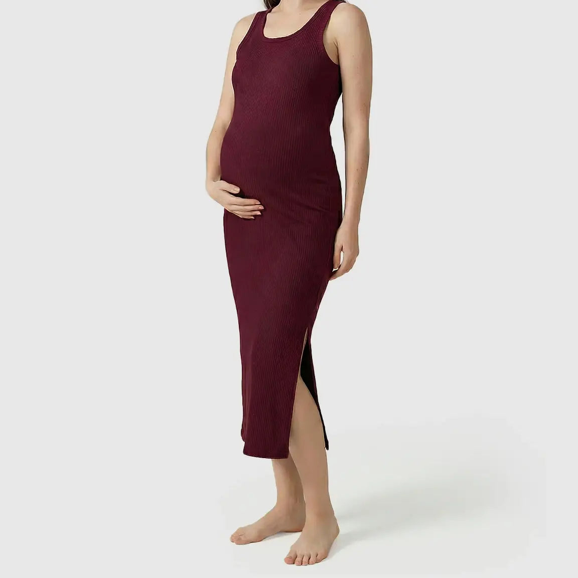 This ribbed maternity midi dress stretches gently around your growing bump while keeping a sleek sculpted shape. The tank style neckline and soft rib knit fabric create an easy flattering look that feels good from morning to night. With its stretchy fit and side slit, this dress supports you through all stages of pregnancy without ever getting in your way.