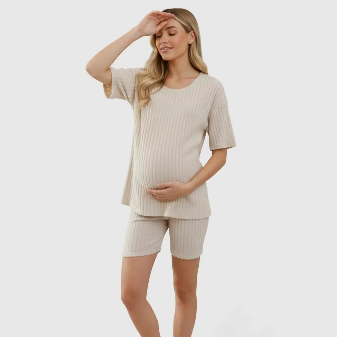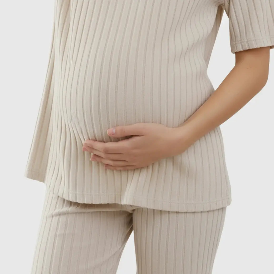This soft ribbed maternity lounge set is designed to move with your bump through every trimester, offering breathable comfort and a relaxed silhouette that never feels restrictive. With its stretchy waistband and lightweight knit, it's the perfect everyday set for lounging, nesting, or staying cool while pregnant.