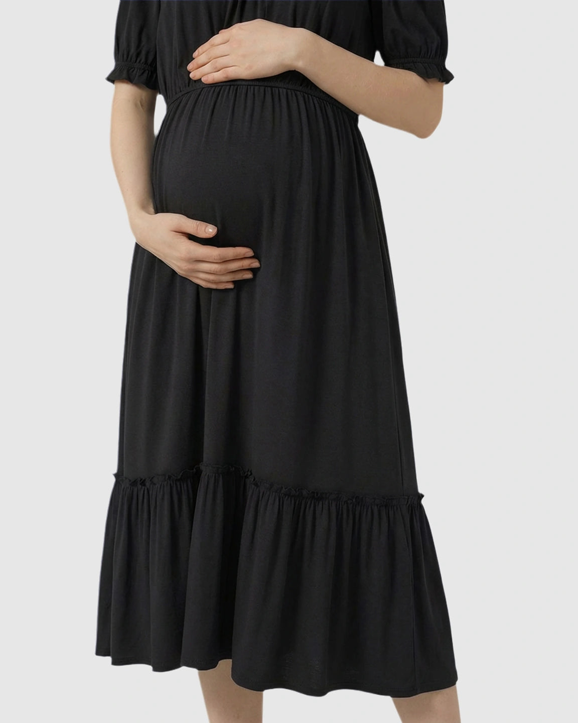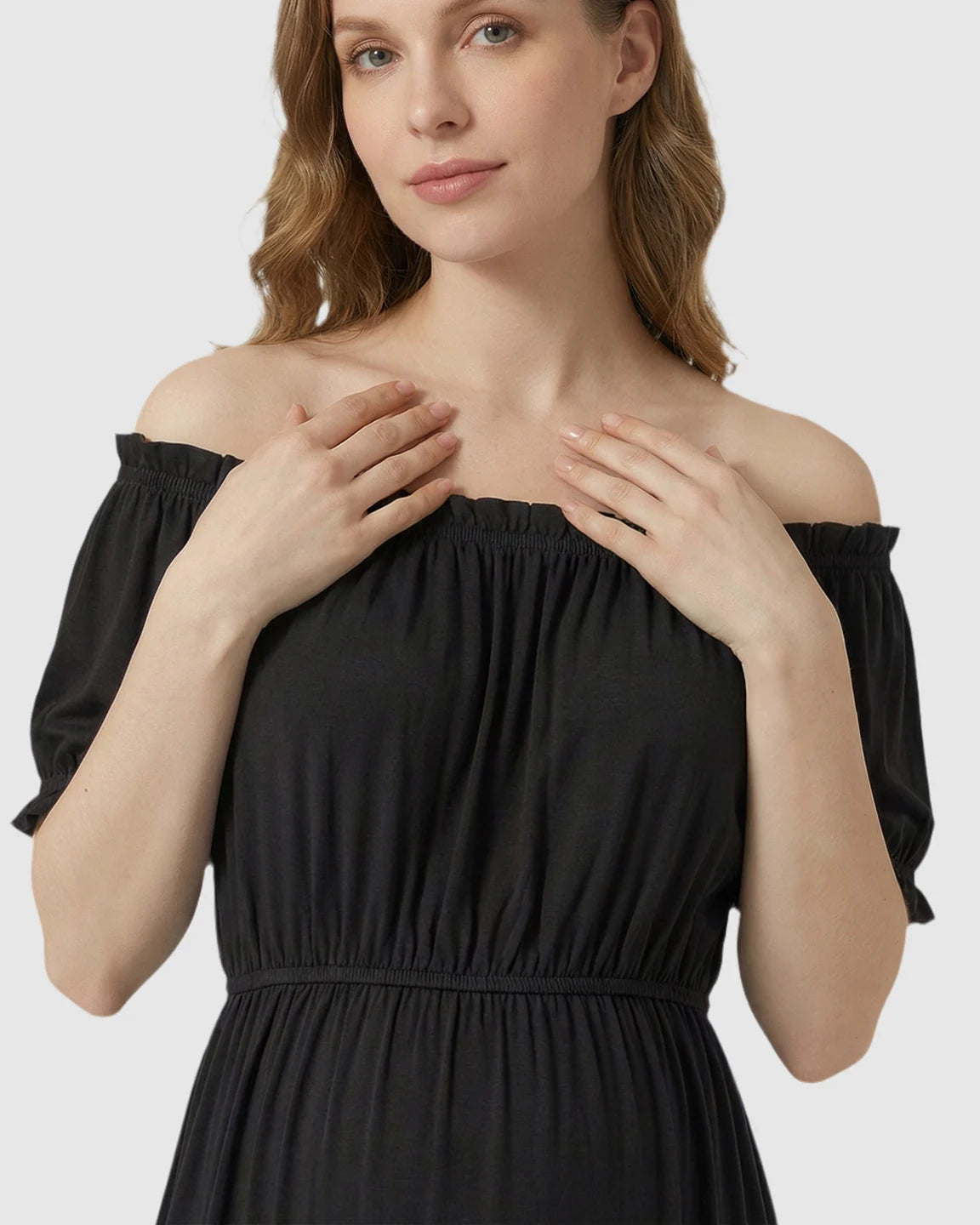 Made from soft, breathable modal fabric with a touch of stretch, it hugs your bump in all the right places while giving you freedom to move. The ruched off-shoulder neckline and multi-layered ruffles add a romantic, feminine touch, perfect for casual dates, social gatherings, or a day out. With a discreet nursing opening, this dress transitions effortlessly from pregnancy to postpartum, keeping you stylish and confident at every stage.