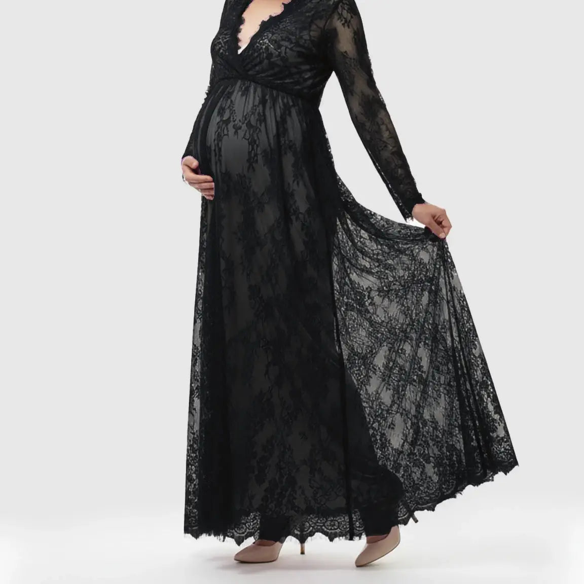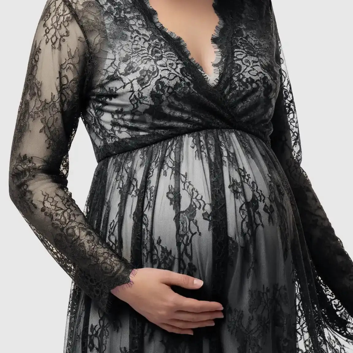Meet the Sheer Floral Lace Empire Waist Maternity Maxi Dress, made for those once-in-a-lifetime moments. The soft lace drapes beautifully, highlighting your bump while giving you a dreamy, feminine silhouette. Designed with a fitted bodice and flowing skirt, this gown moves effortlessly with your pregnancy, making it perfect for maternity photoshoots, baby showers, and elegant events throughout every stage of maternity.